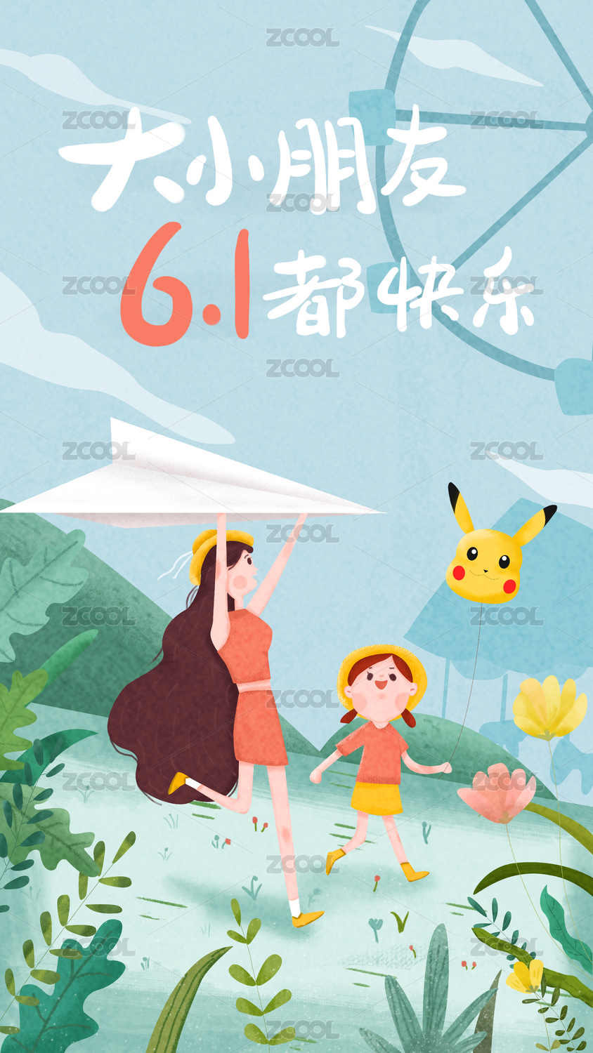 一個(gè)舉著紙飛機(jī)的媽媽帶著拿著氣球的女兒在草地上奔跑