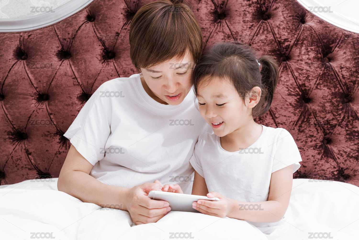 穿白色襯衣的母親和女兒坐在床上一起看手機(jī)
