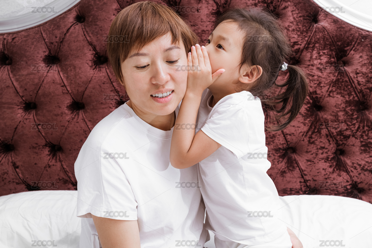 穿白色襯衣的母親和女兒坐在床上低聲耳語