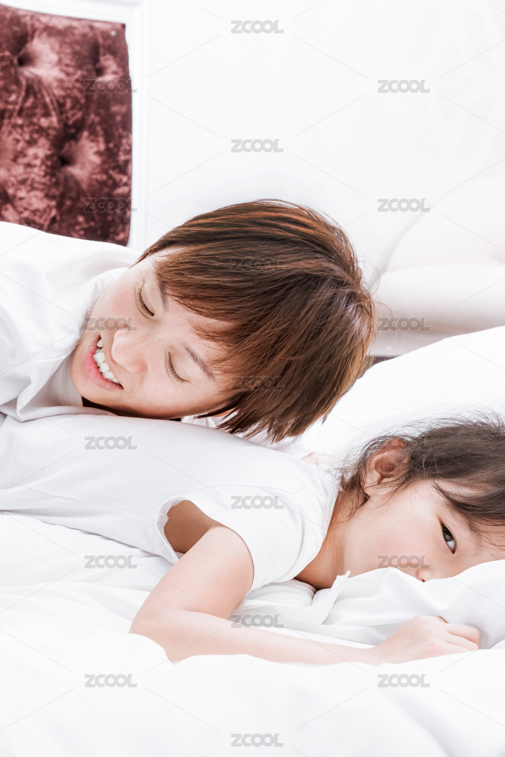 穿白色襯衣的母親與女兒趴在床上玩耍