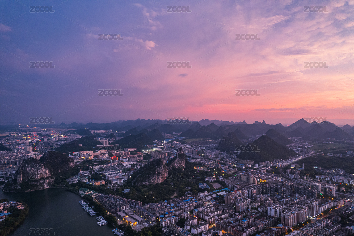 桂林漓江沿岸城市風(fēng)景自然風(fēng)光日落晚霞航拍