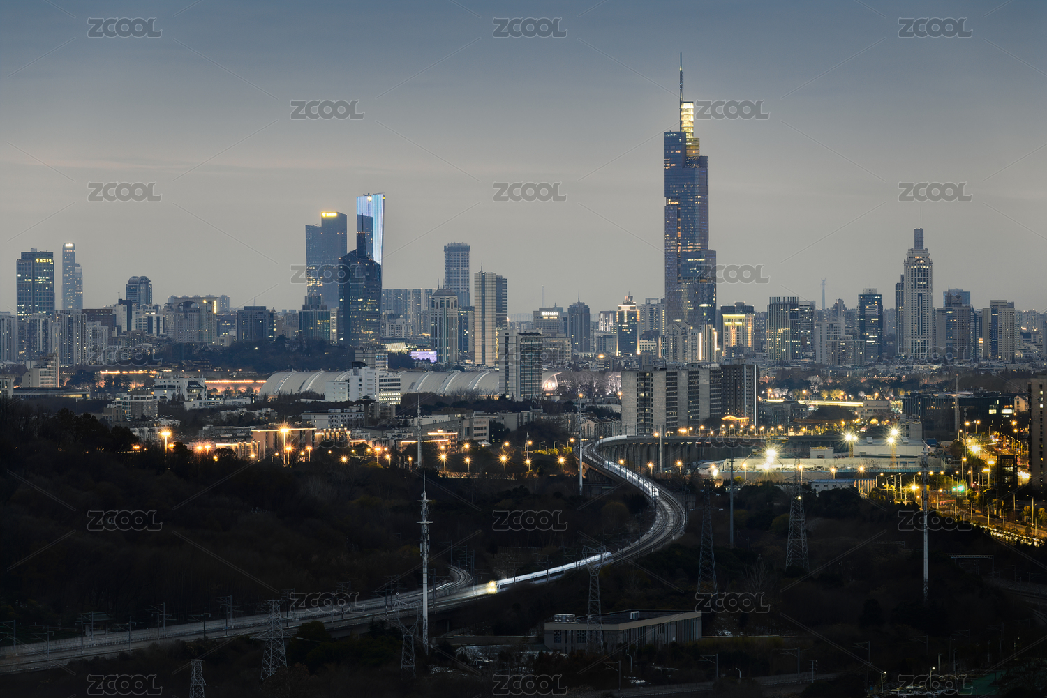 傍晚南京紫峰大廈與南京鐵路交通S曲線同框