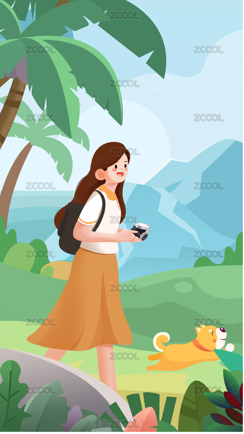 春季出游季旅行節(jié)日插畫女孩和小狗旅行拍照