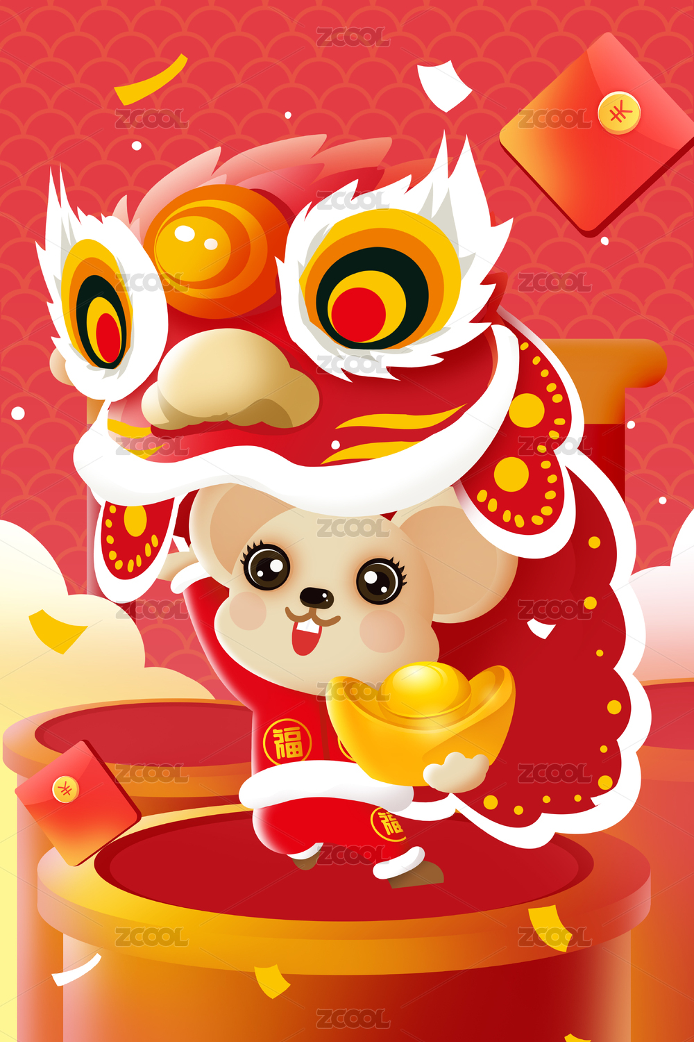 卡通手繪新年紅色喜慶老鼠舞獅紅包閃屏插畫