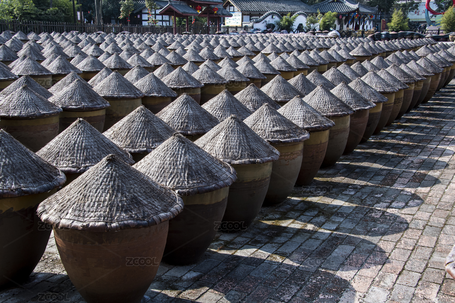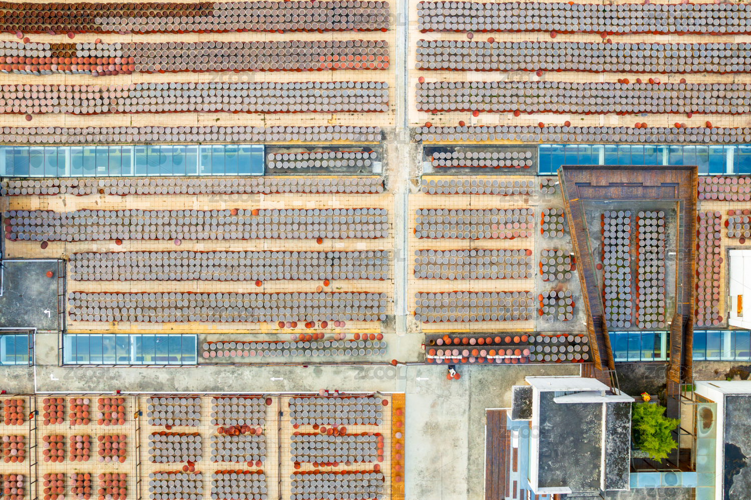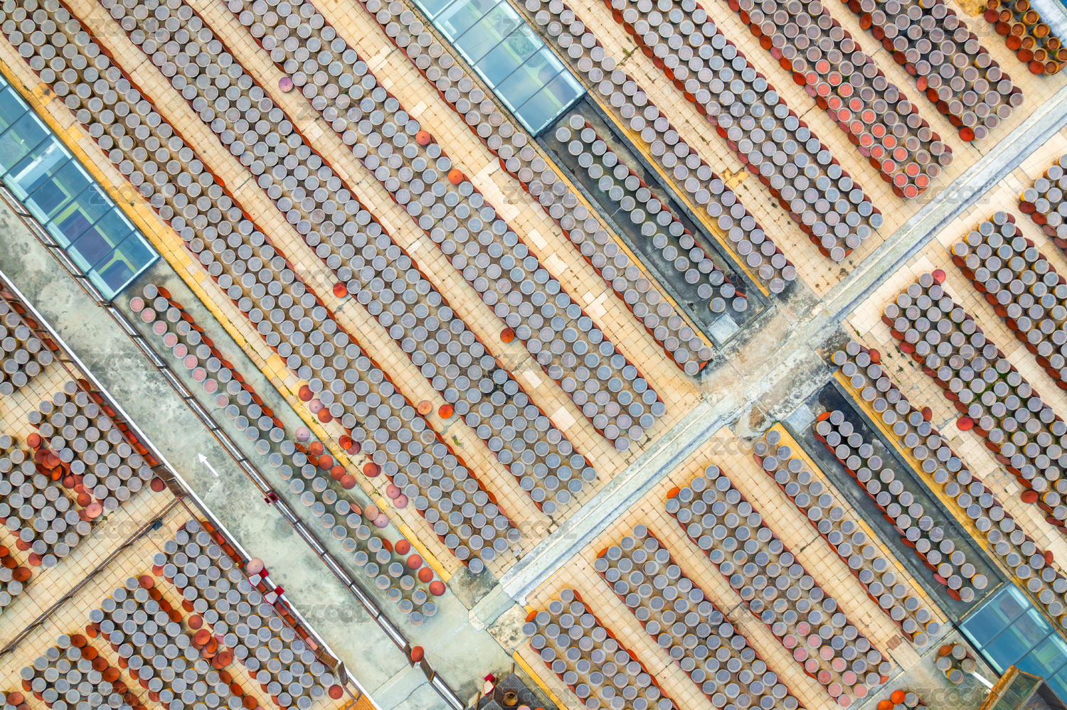 成都郫縣豆瓣生產(chǎn)過程,屋頂瓦缸晾曬航拍