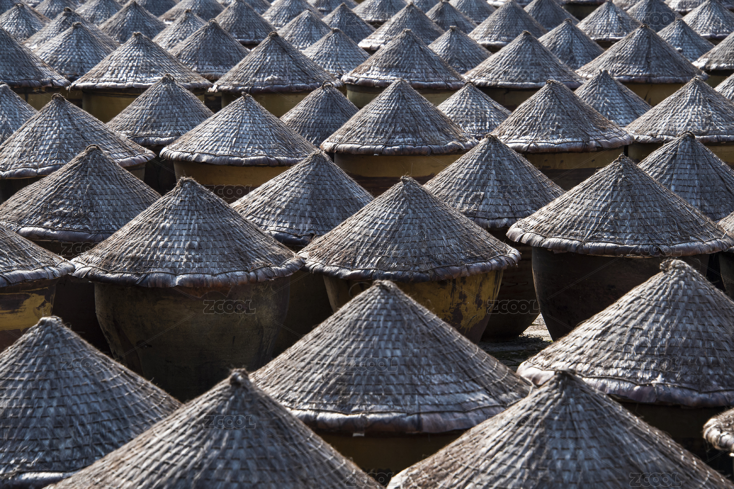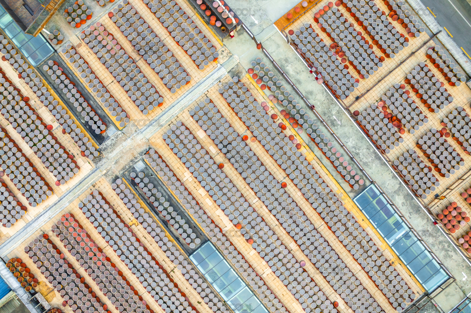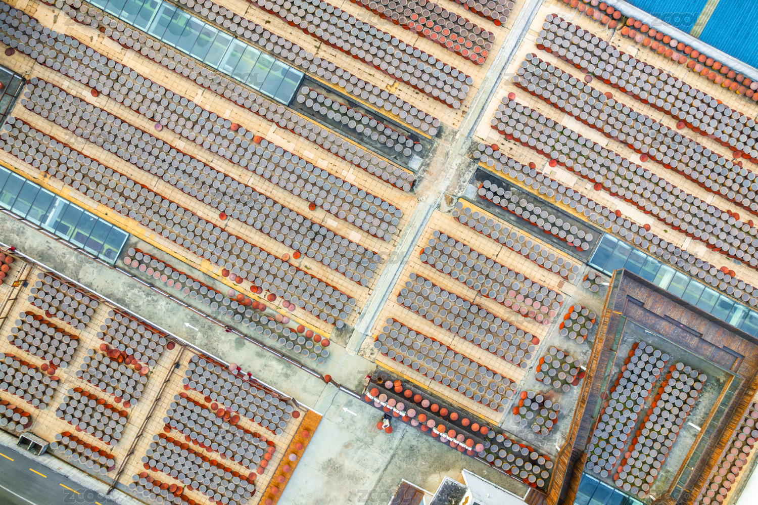 成都郫縣豆瓣生產(chǎn)過程,屋頂瓦缸晾曬航拍