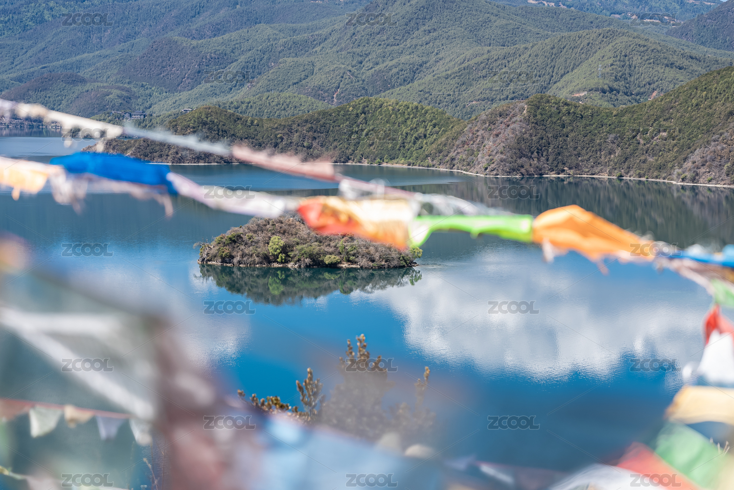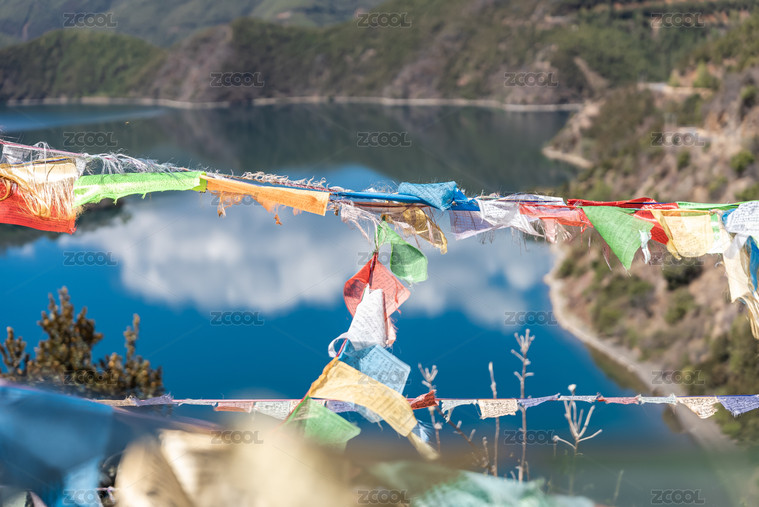 中國瀘沽湖旁邊飄舞的佛教經(jīng)幡