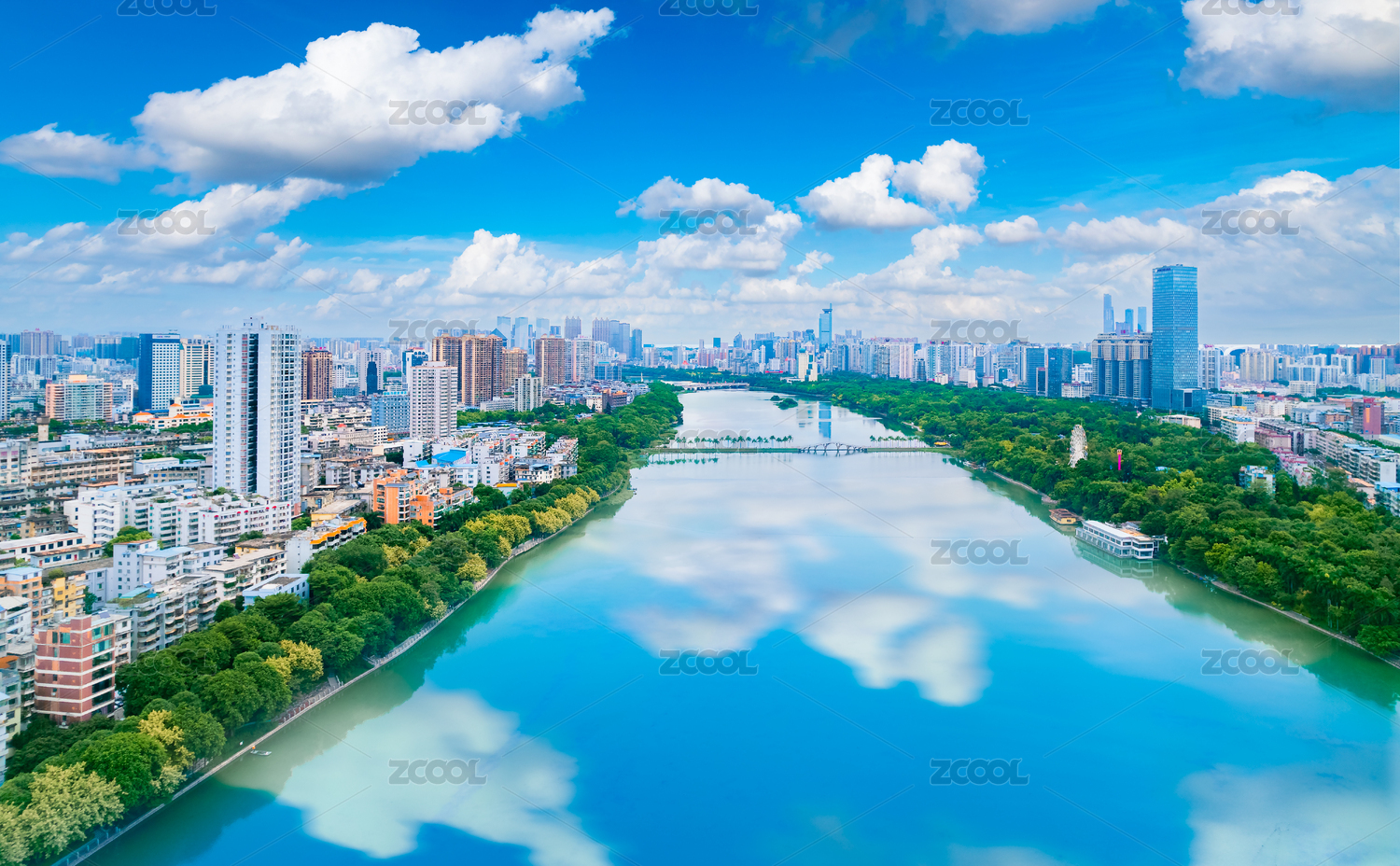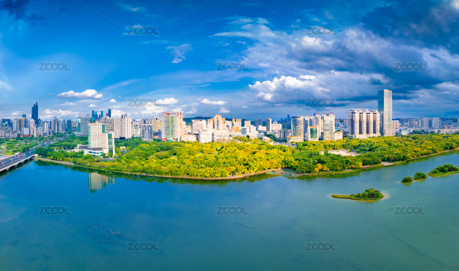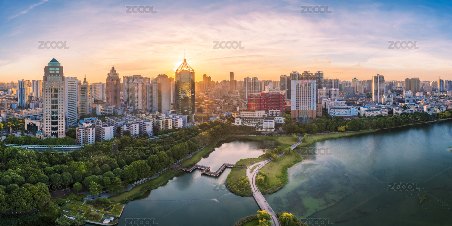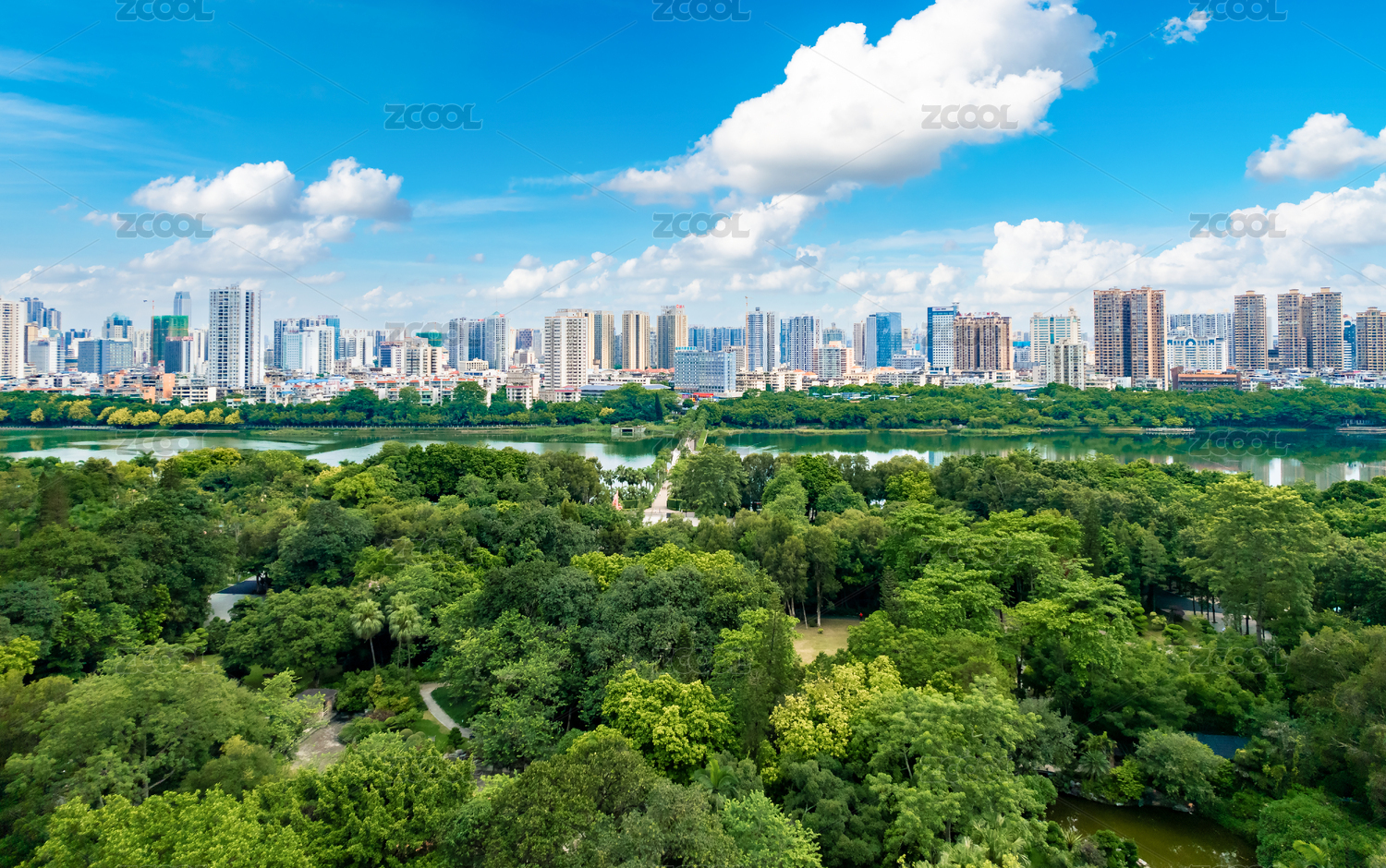 南寧南湖公園綠色樹林與城市摩天大樓建筑群