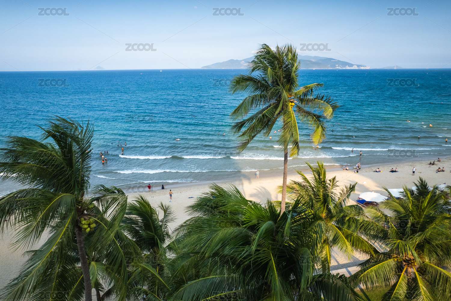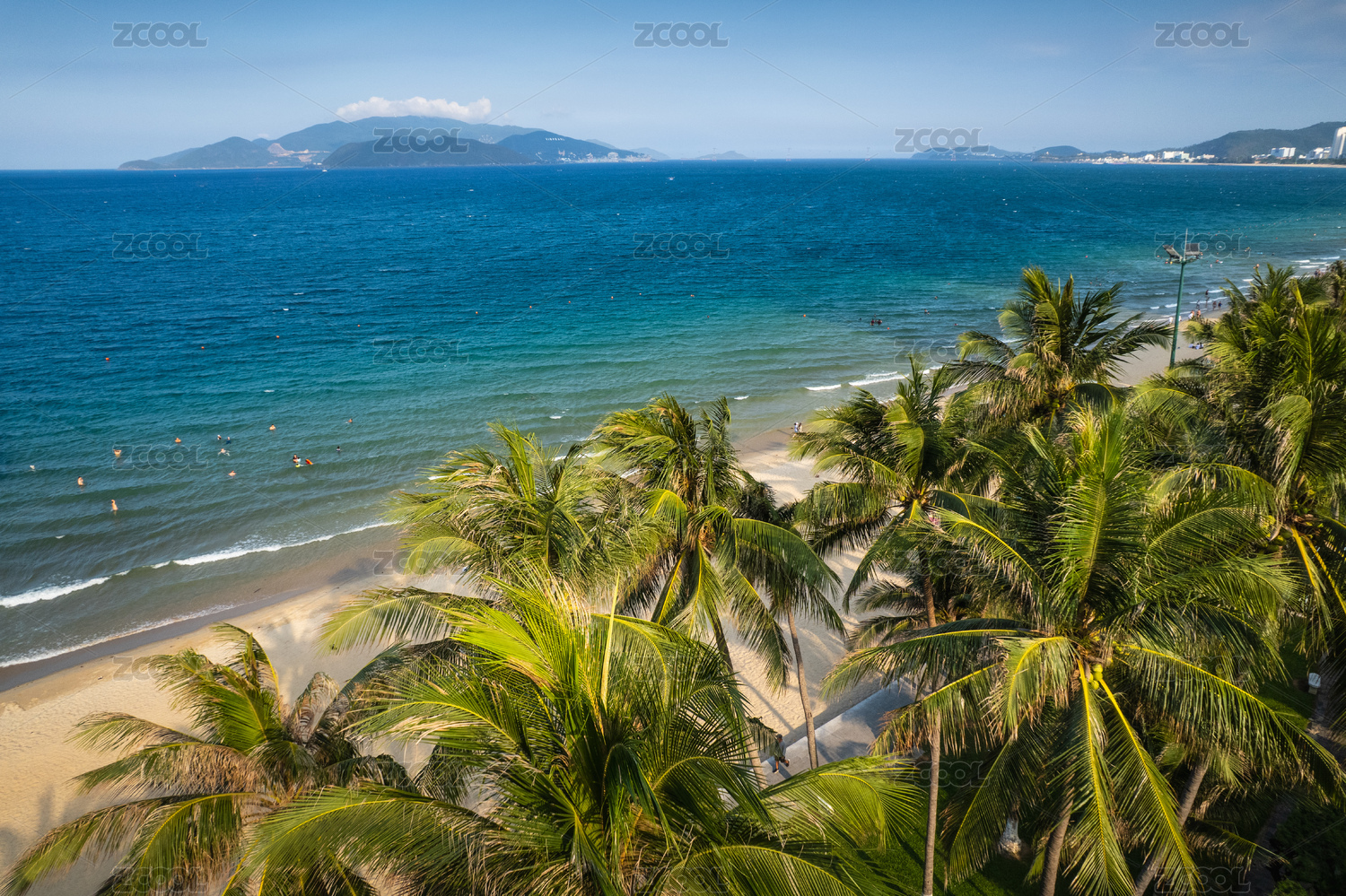 越南芽莊城市棕櫚樹海濱沙灘自然風(fēng)光航拍