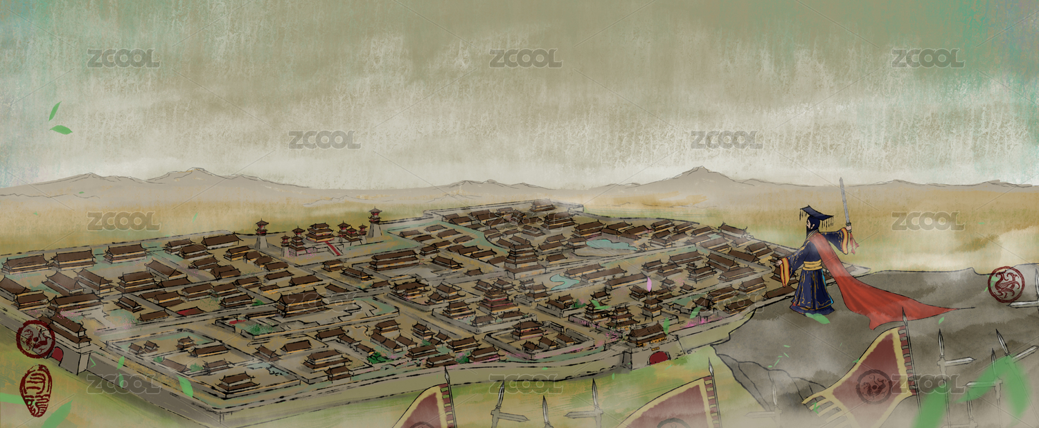 國(guó)風(fēng)龍長(zhǎng)城祥云秦始皇插畫