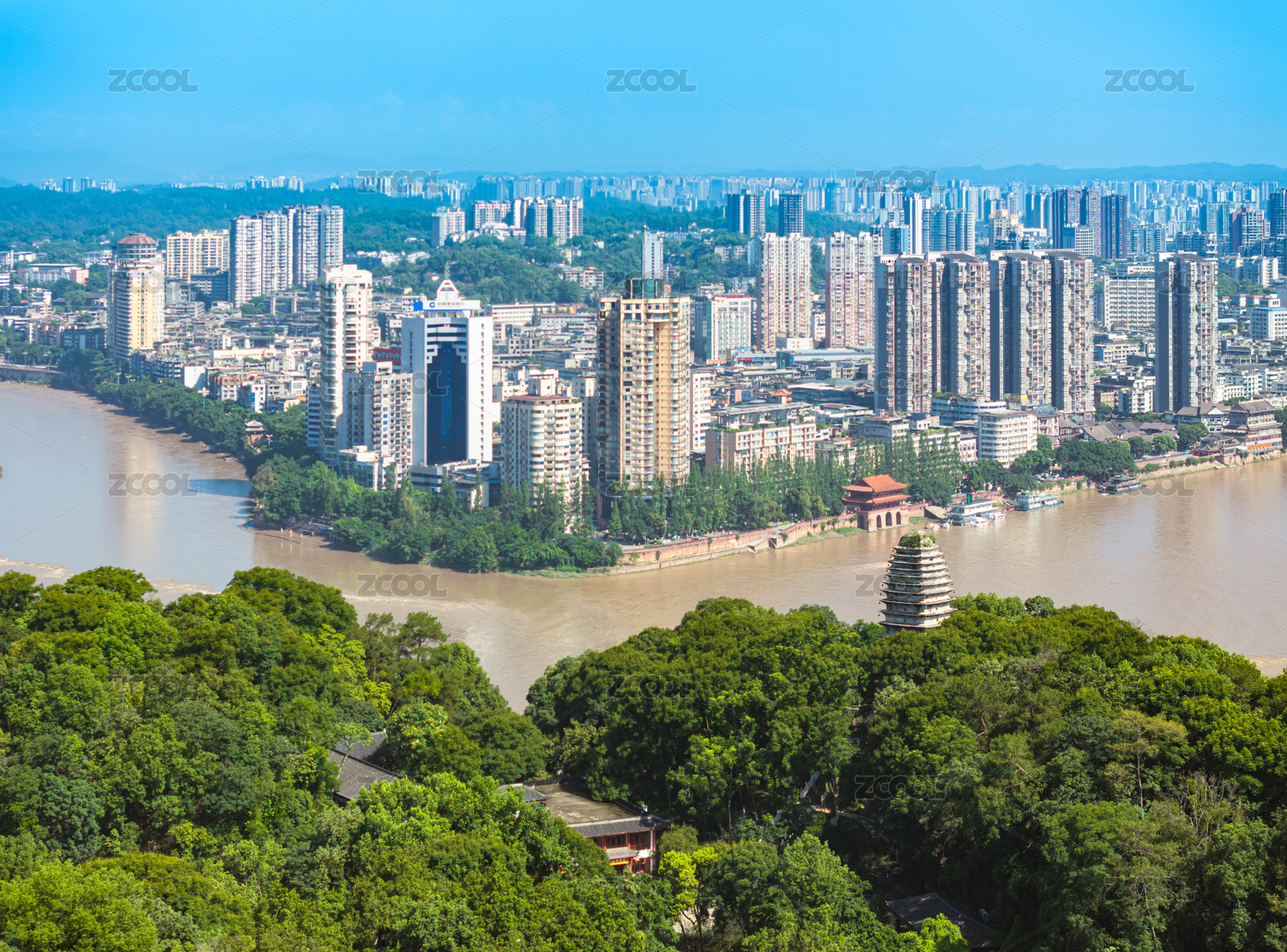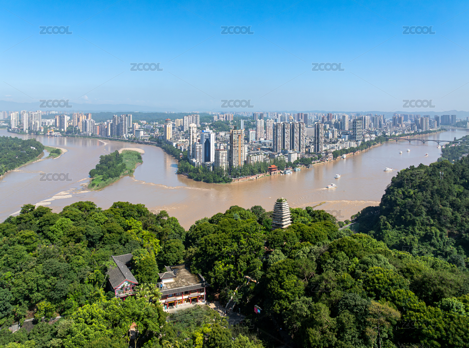 中國(guó)四川樂山凌云寺靈寶塔下的城市航拍圖