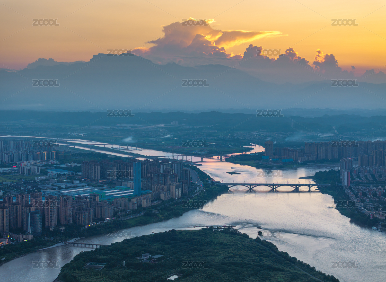 中國(guó)四川峨眉山山下的樂山市區(qū)落日航拍圖