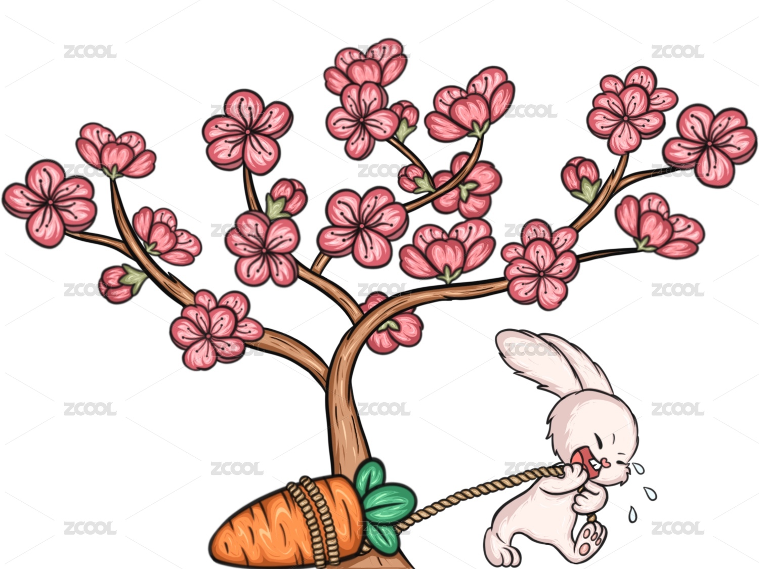 在梅花樹下用力拉胡蘿卜的小兔子