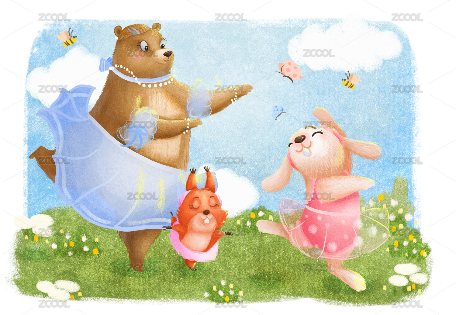 夏天草地上跳舞的小兔子、小松鼠和小熊