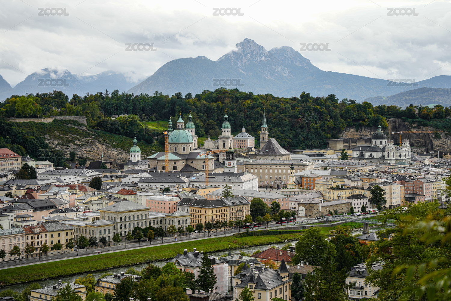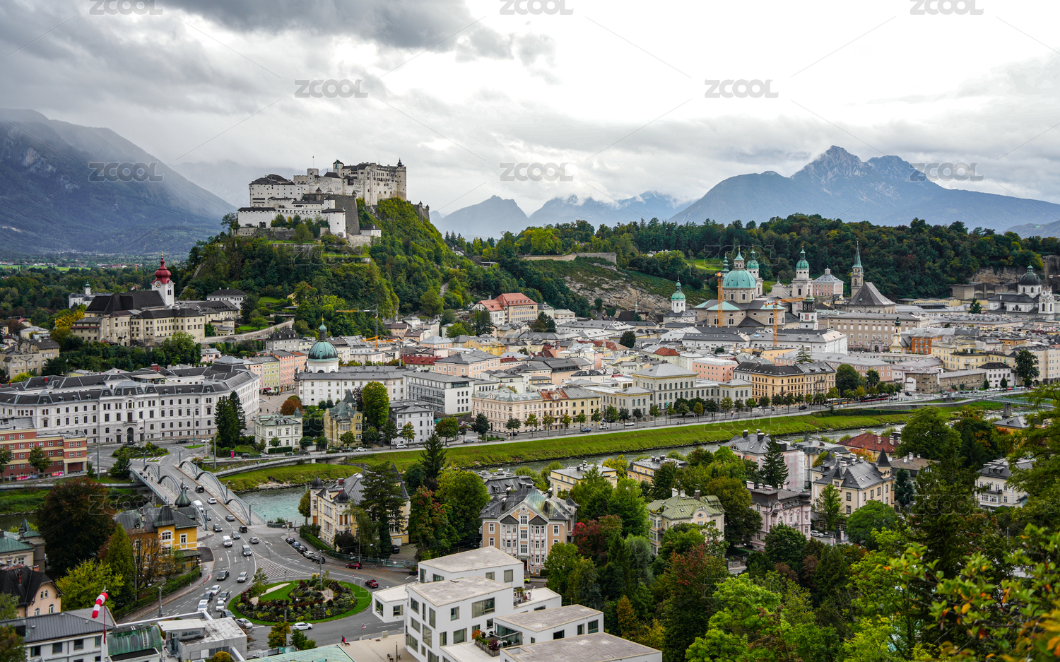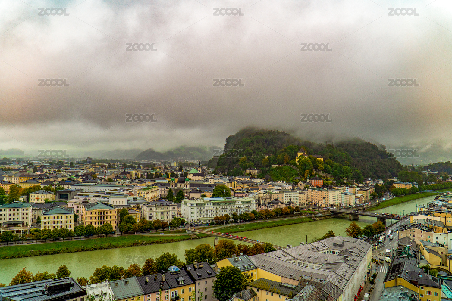 歐洲奧地利薩爾茨堡城市帶山水陰天全景