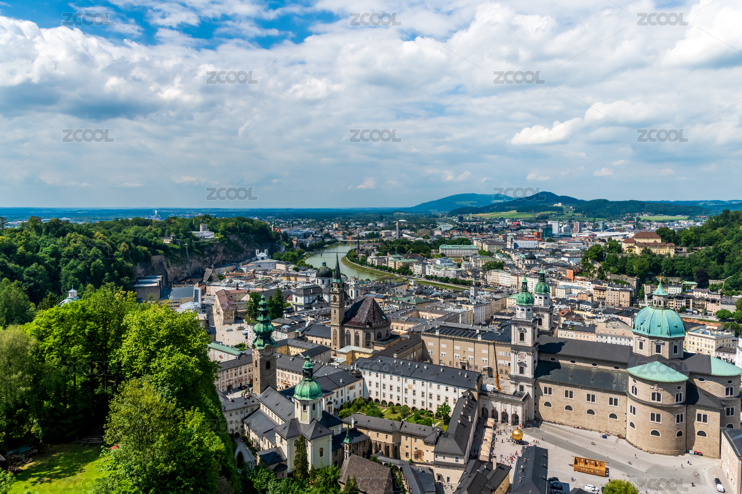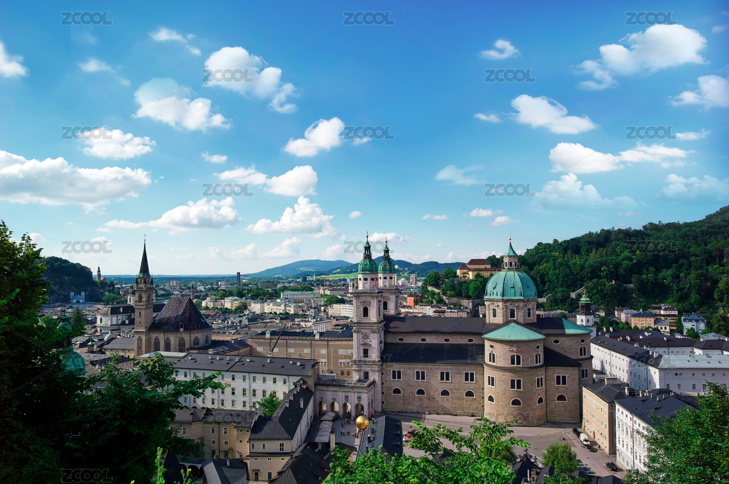 奧地利薩爾茨堡藍(lán)天白云下的城市全景