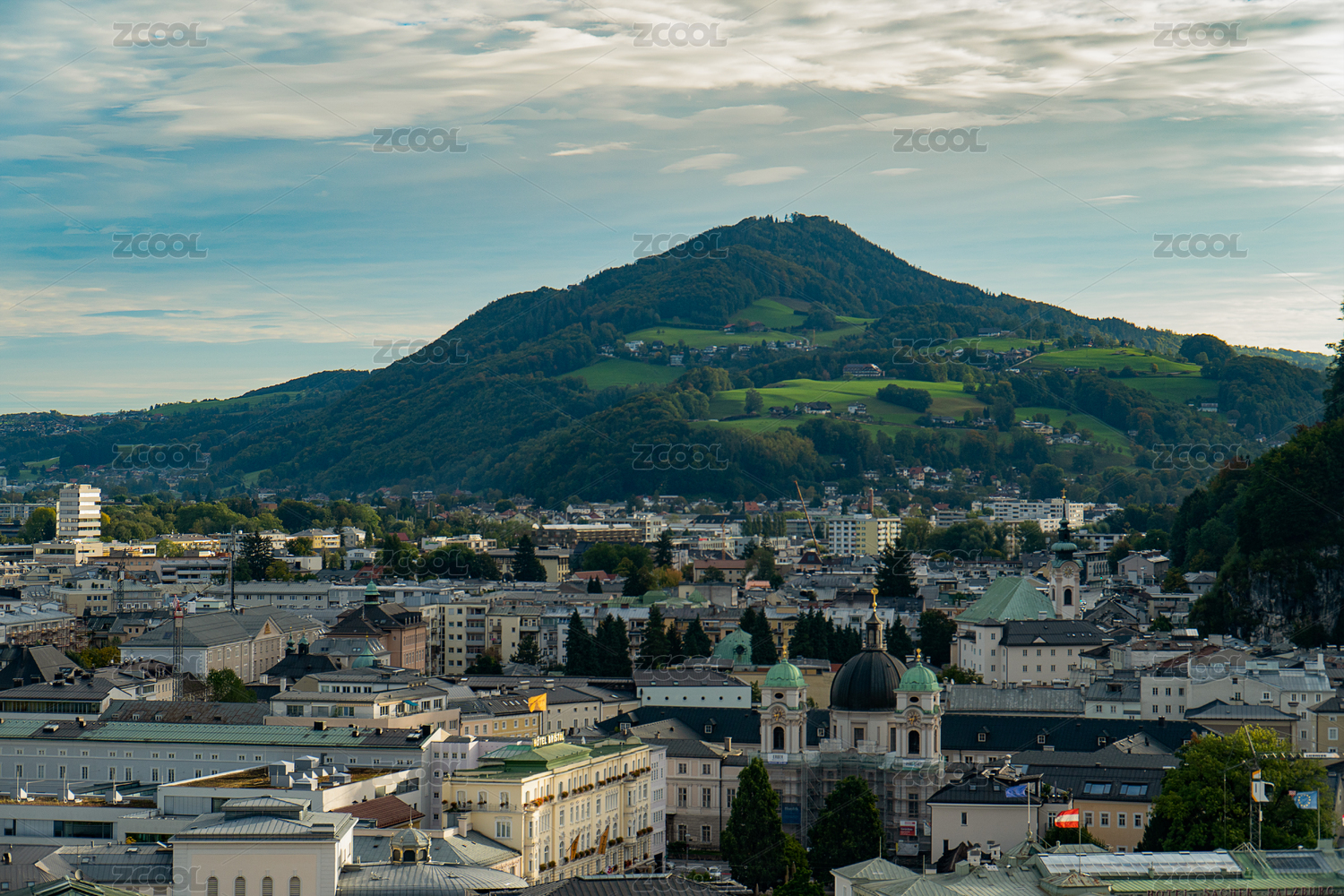 歐洲奧地利薩爾茨堡城市晴天背景山脈小全景