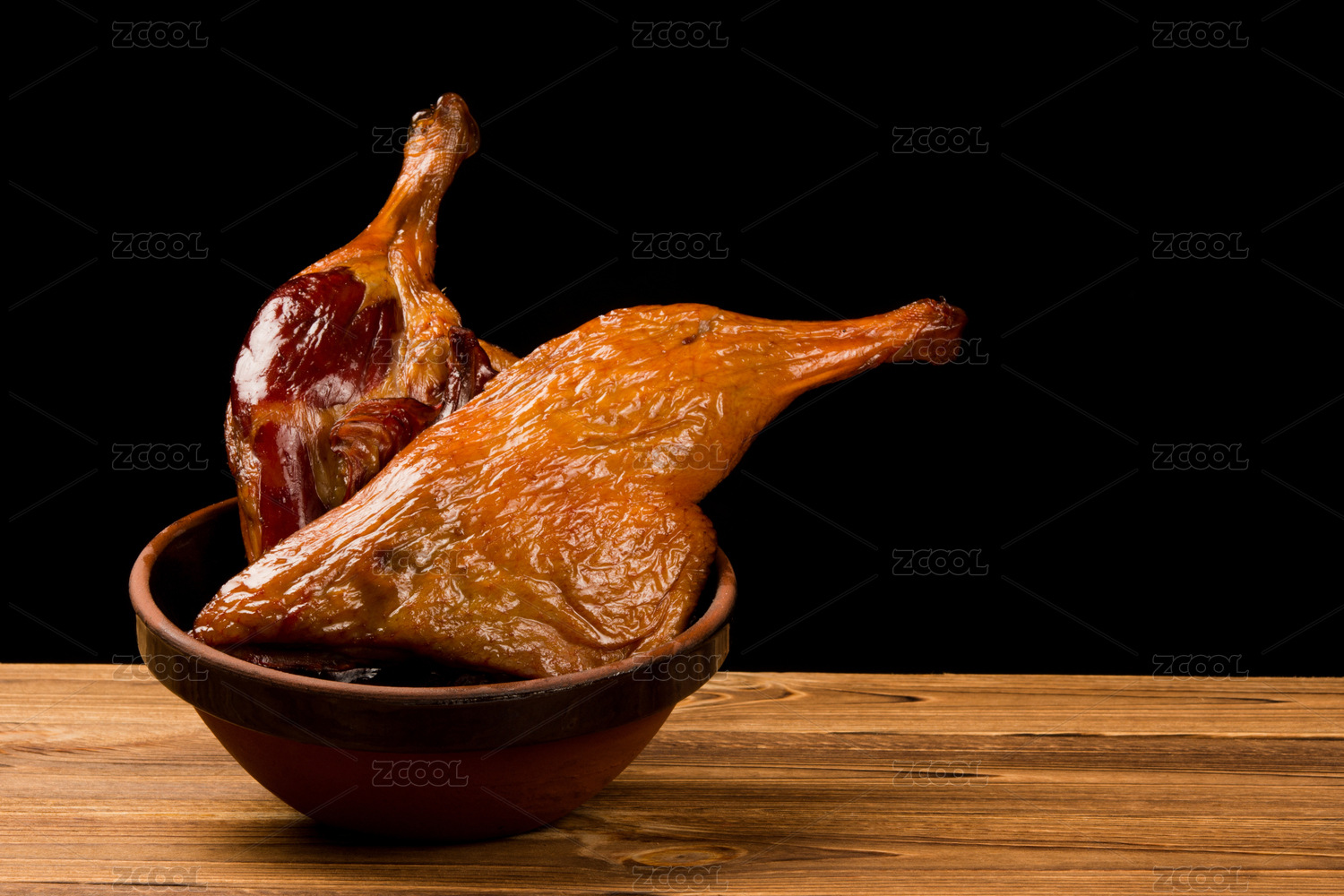 一個(gè)陶碗里面裝著風(fēng)干的臘鴨腿,放在木紋桌面上,黑色背景