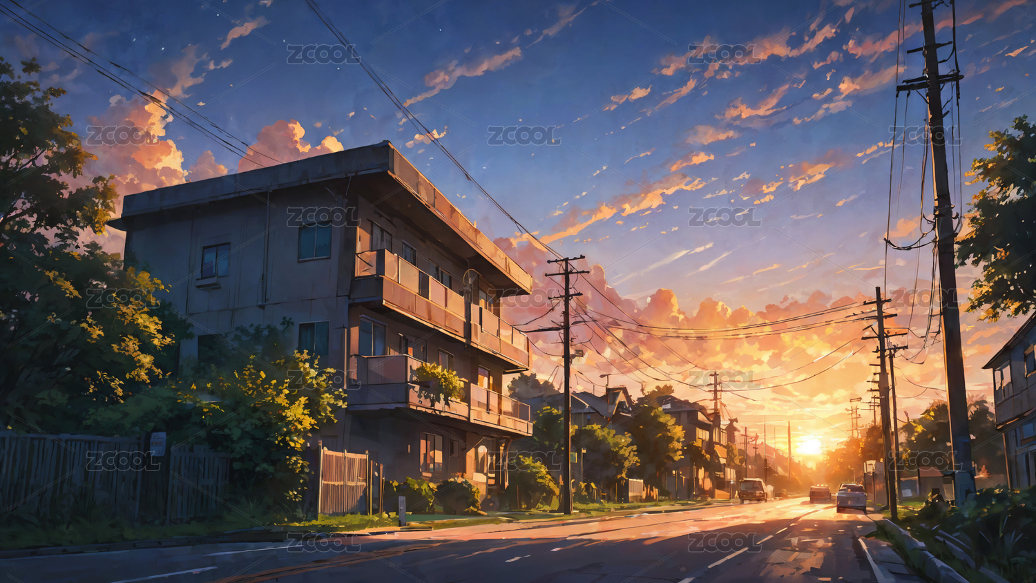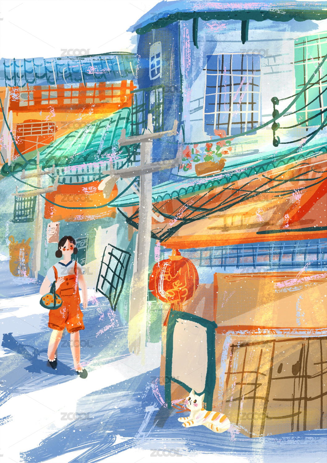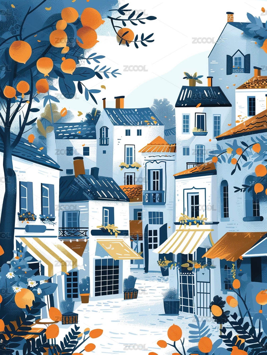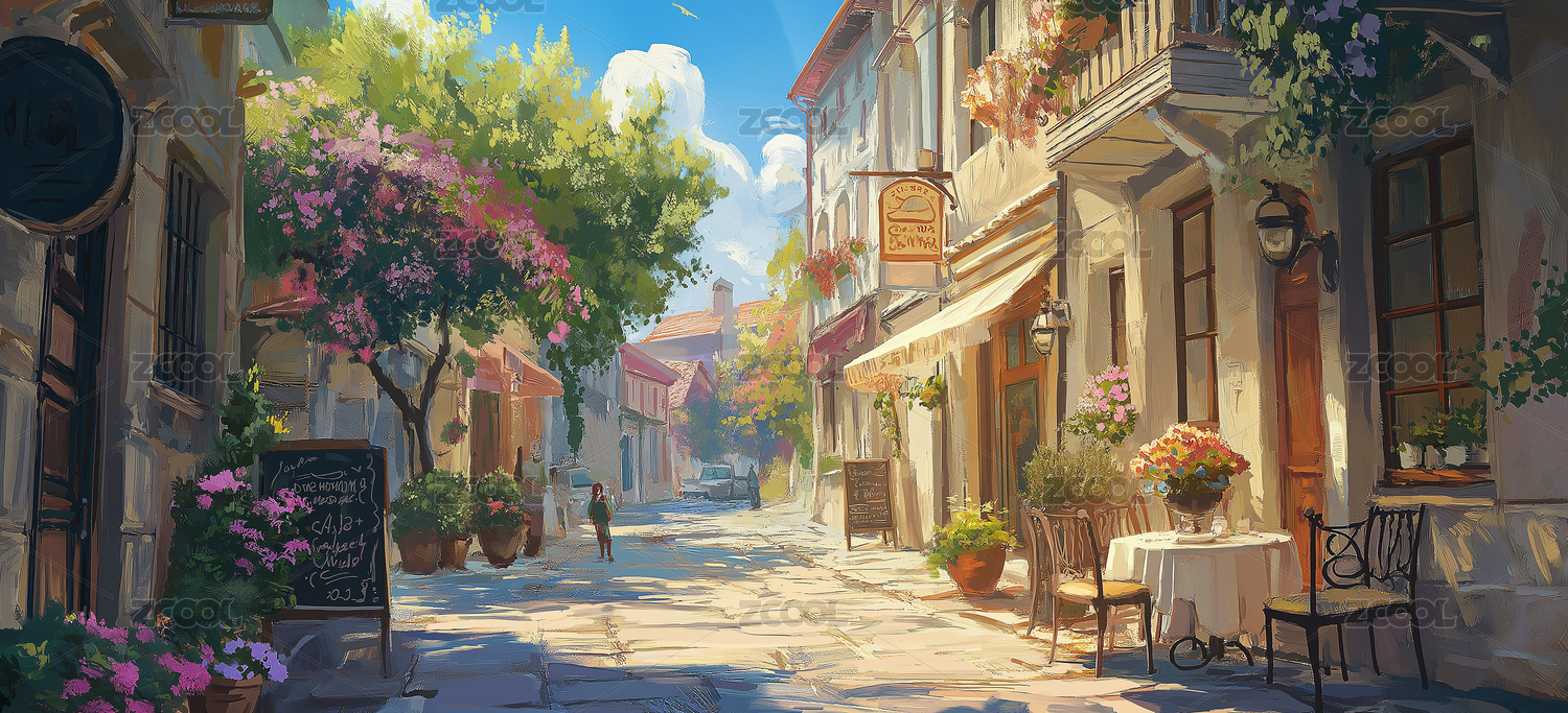 小鎮(zhèn)建筑街道風(fēng)情插畫