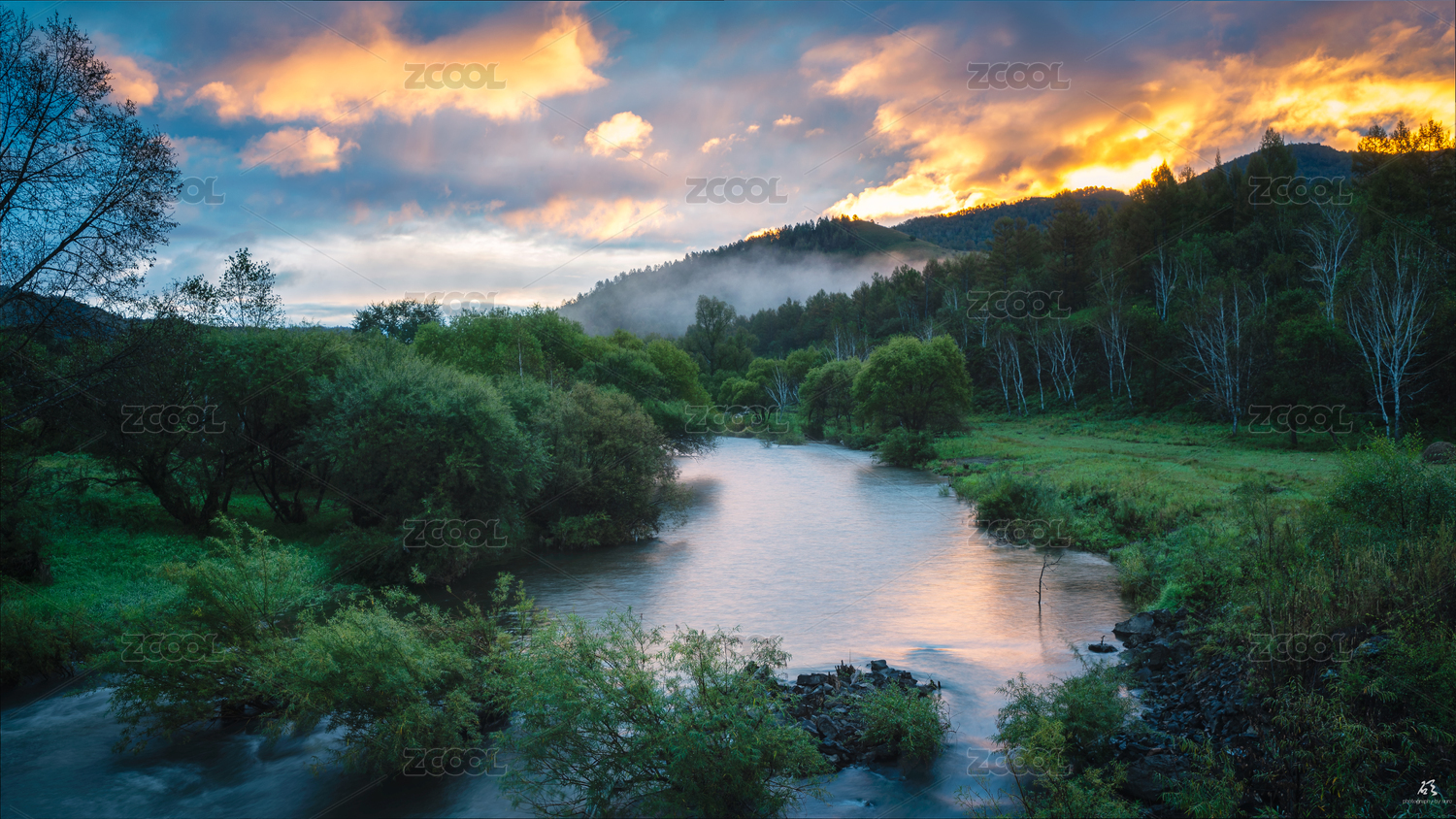 內(nèi)蒙古柴河小鎮(zhèn)清晨晨霧朝霞溪水仙境