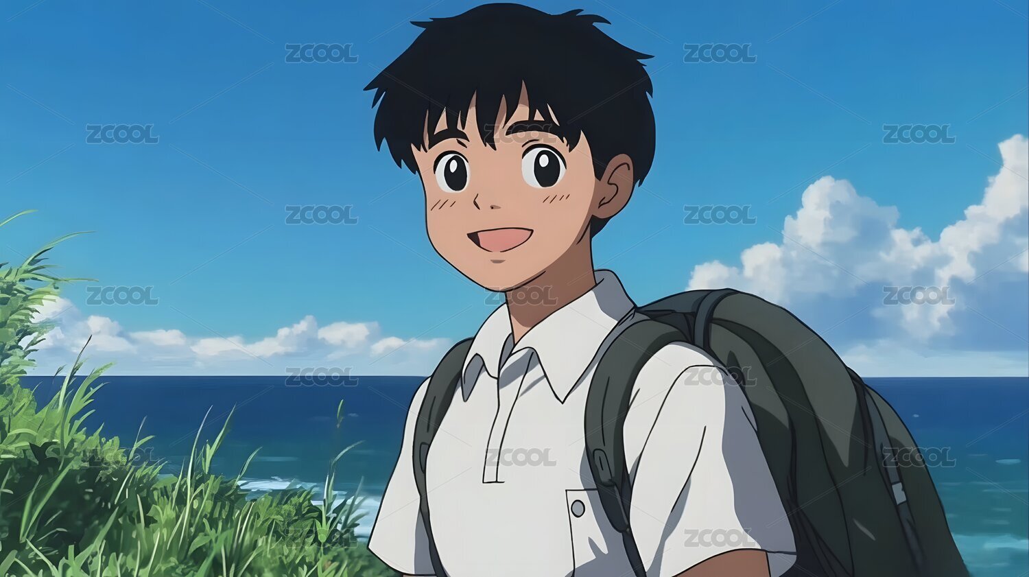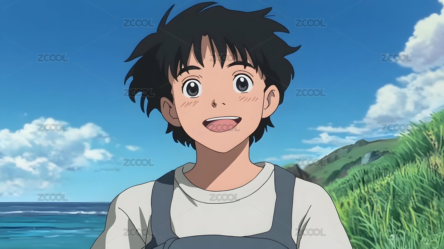 宮崎駿日漫人物年輕亞洲男孩微笑頭像戶外