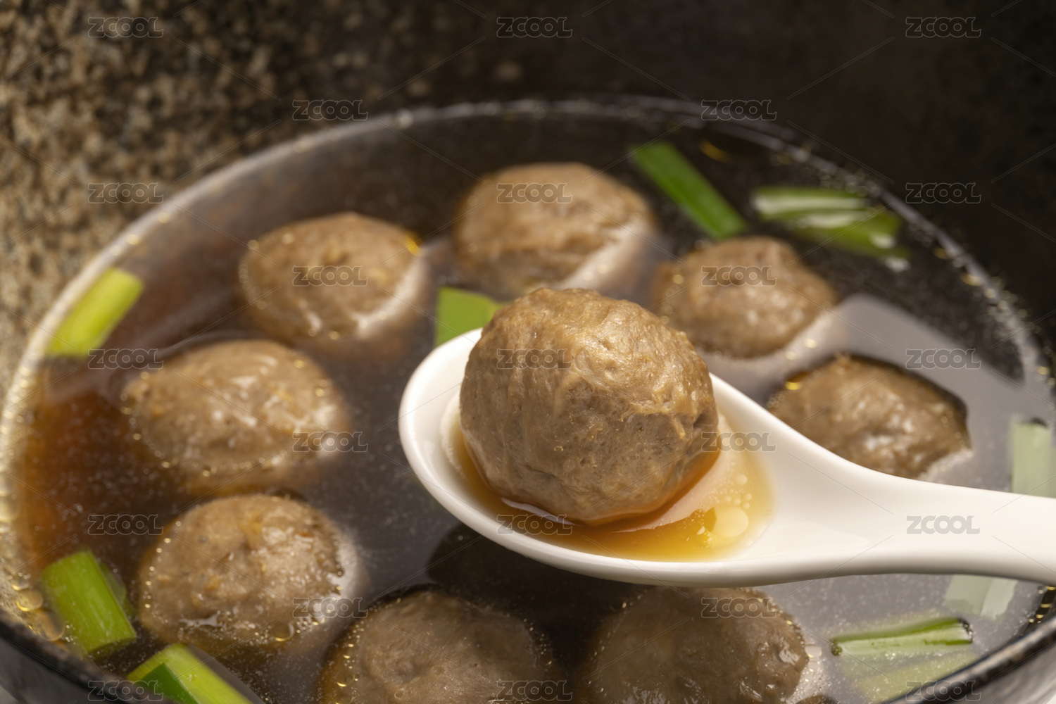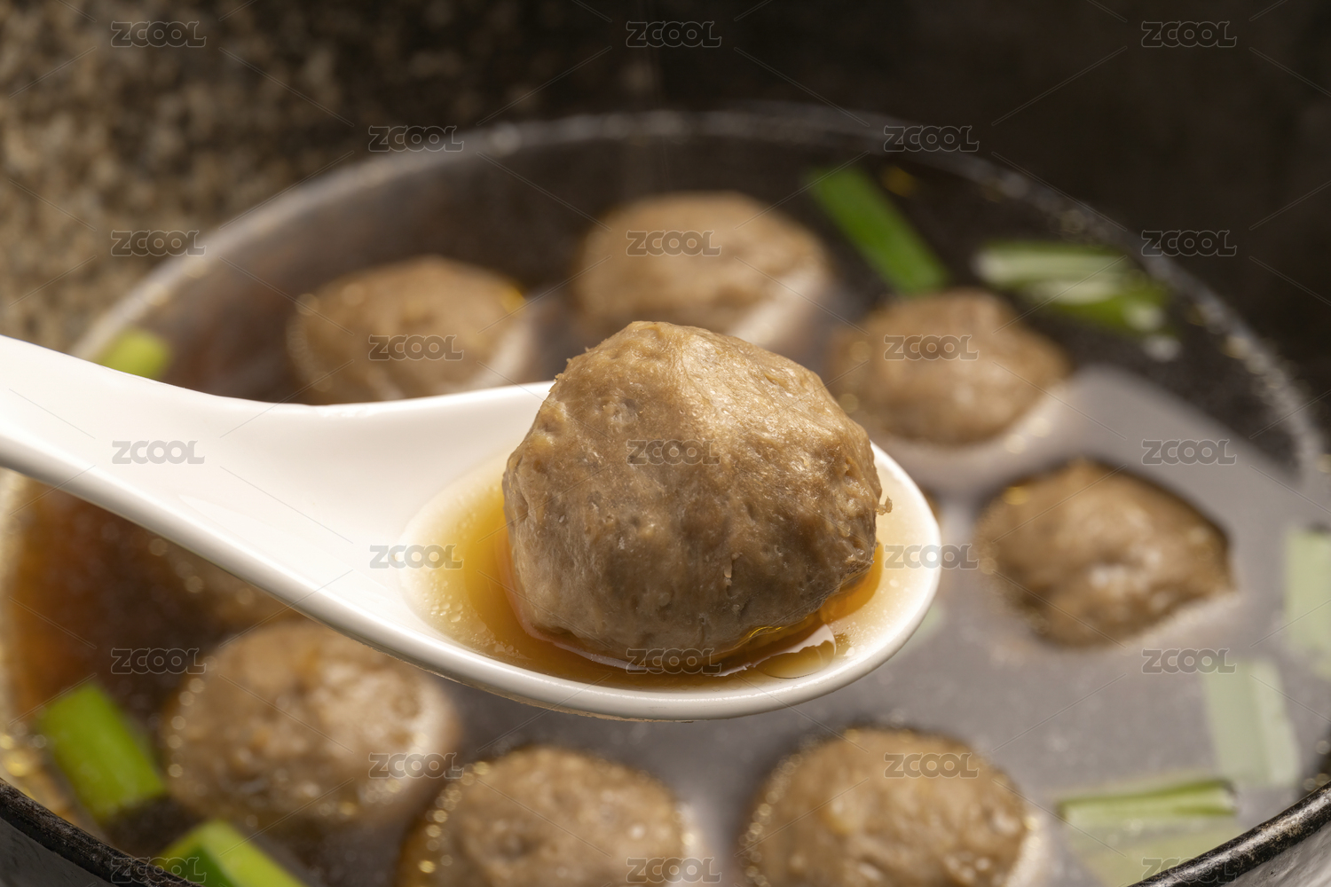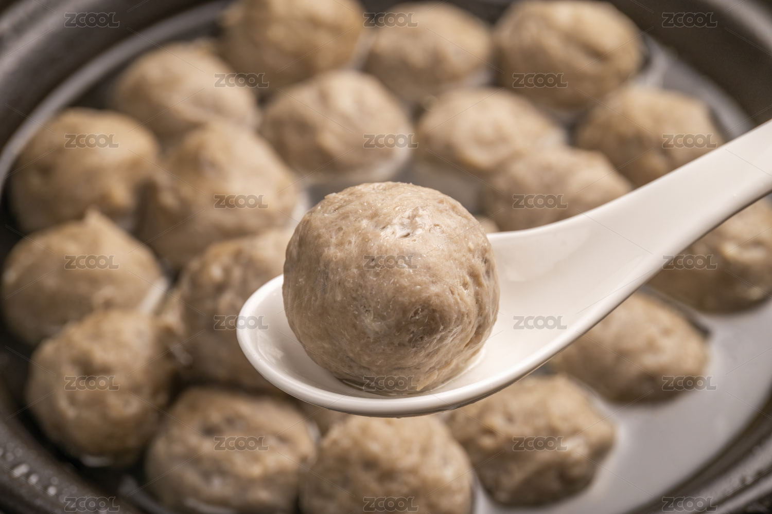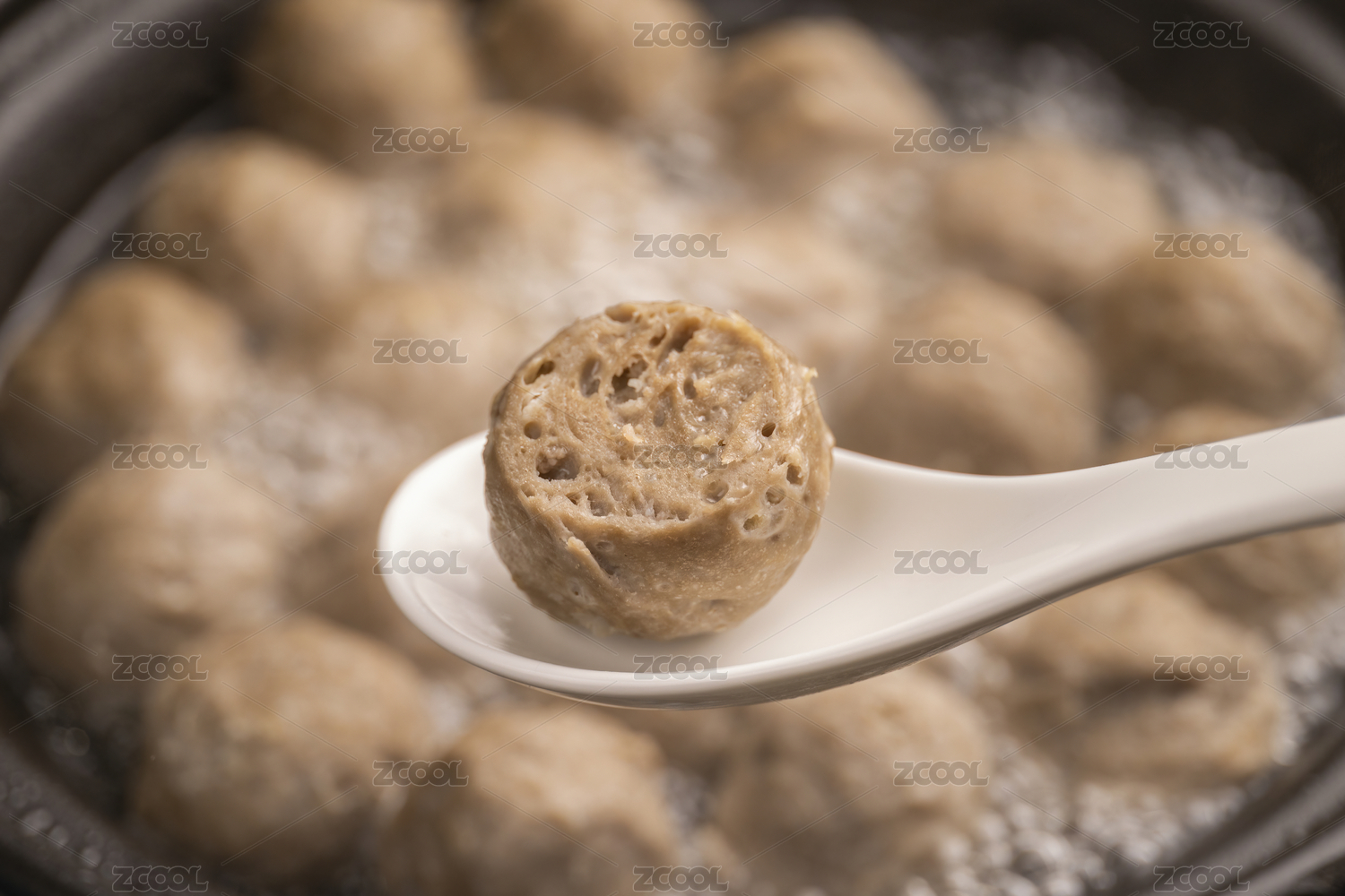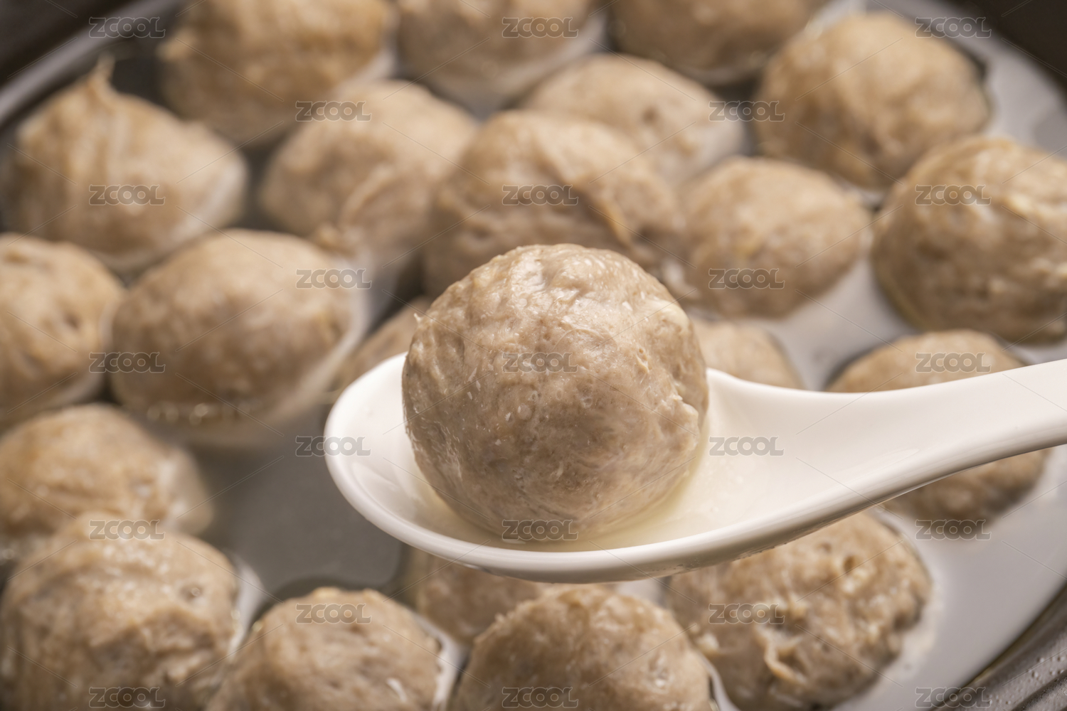 白色勺子舀起潮汕牛肉丸牛筋丸火鍋丸子