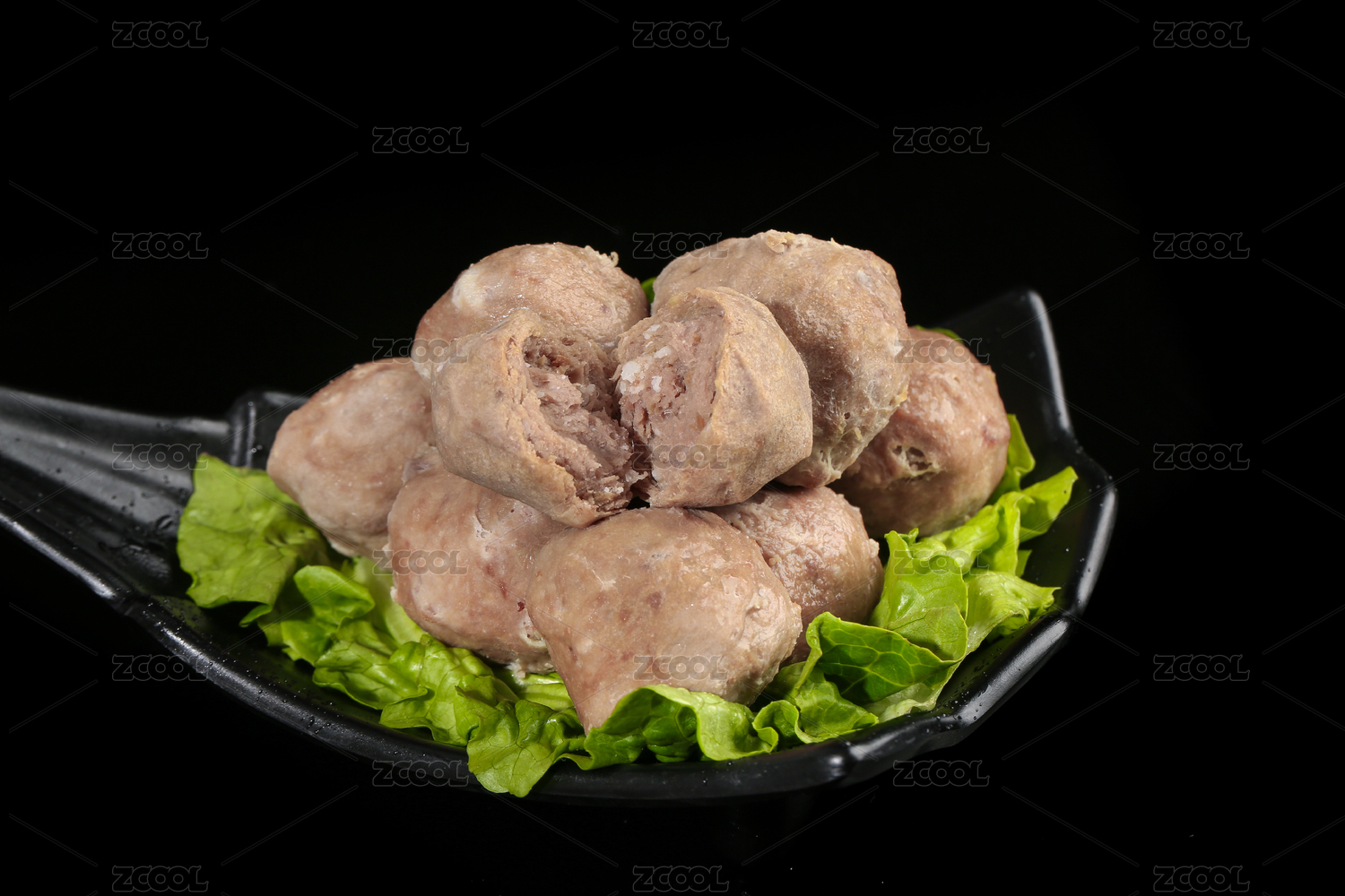 菜葉子上放著一顆切開的牛筋丸和半邊牛肉丸