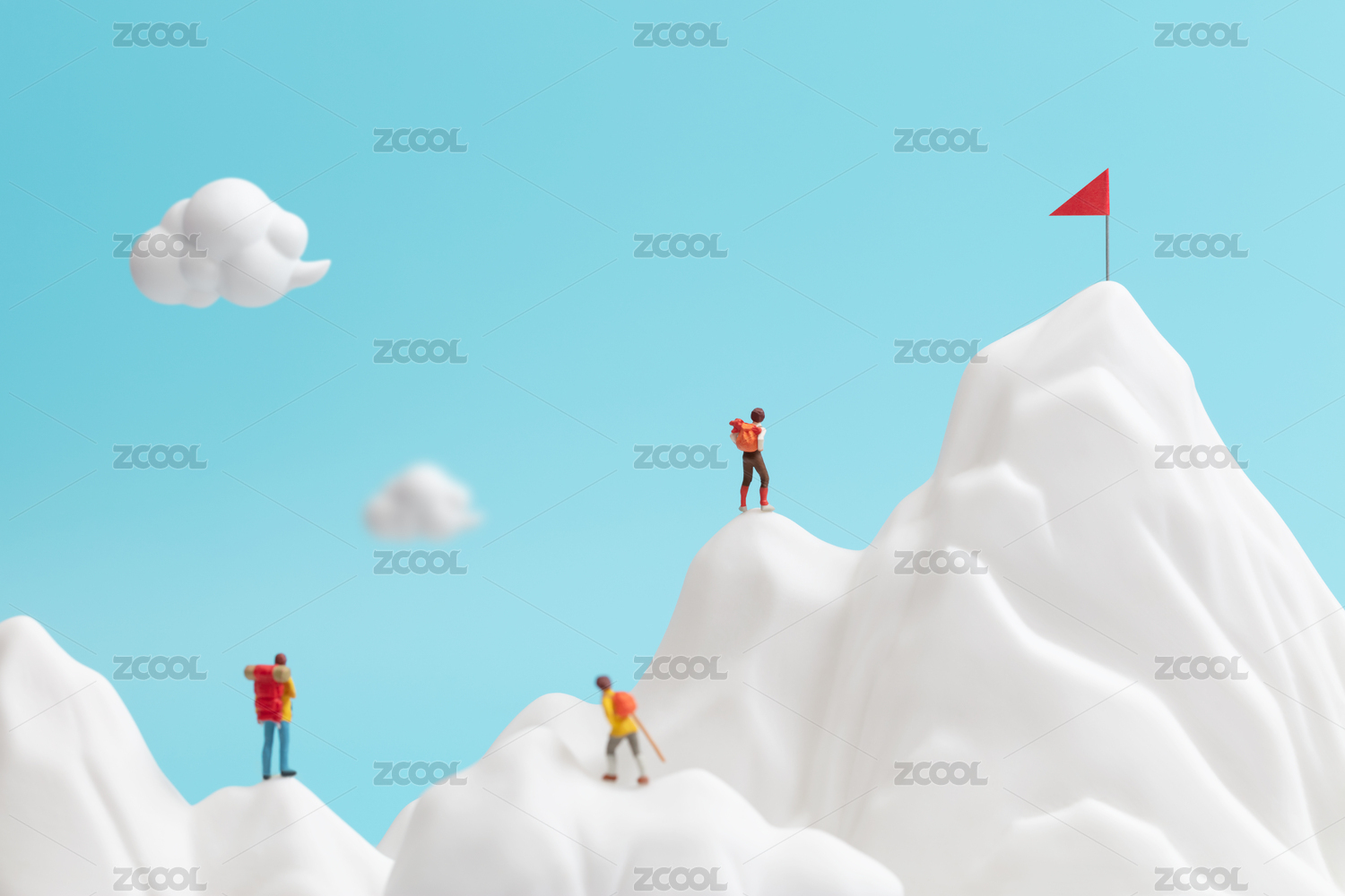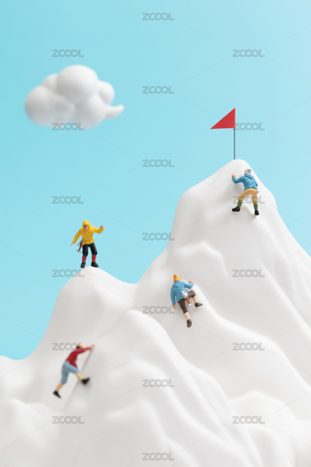 微縮創(chuàng)意藍(lán)天白云下的雪山與攀登者