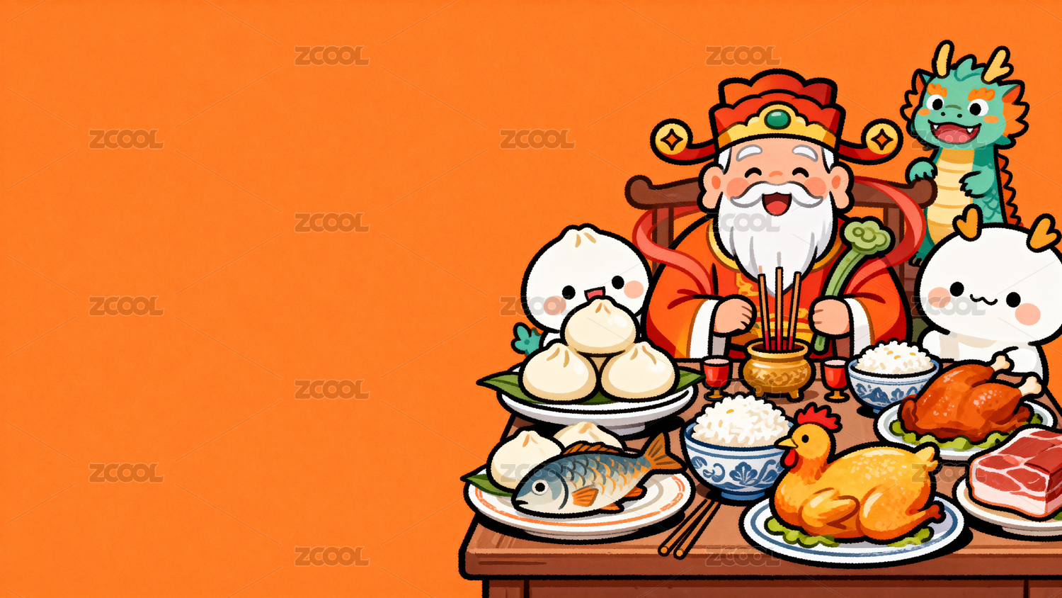 卡通財神爺宴請萌物歡樂場景