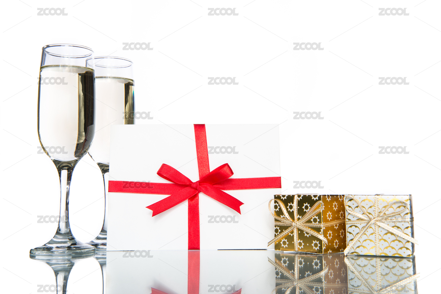 香檳禮物和卡片在白色背景,慶祝節(jié)日