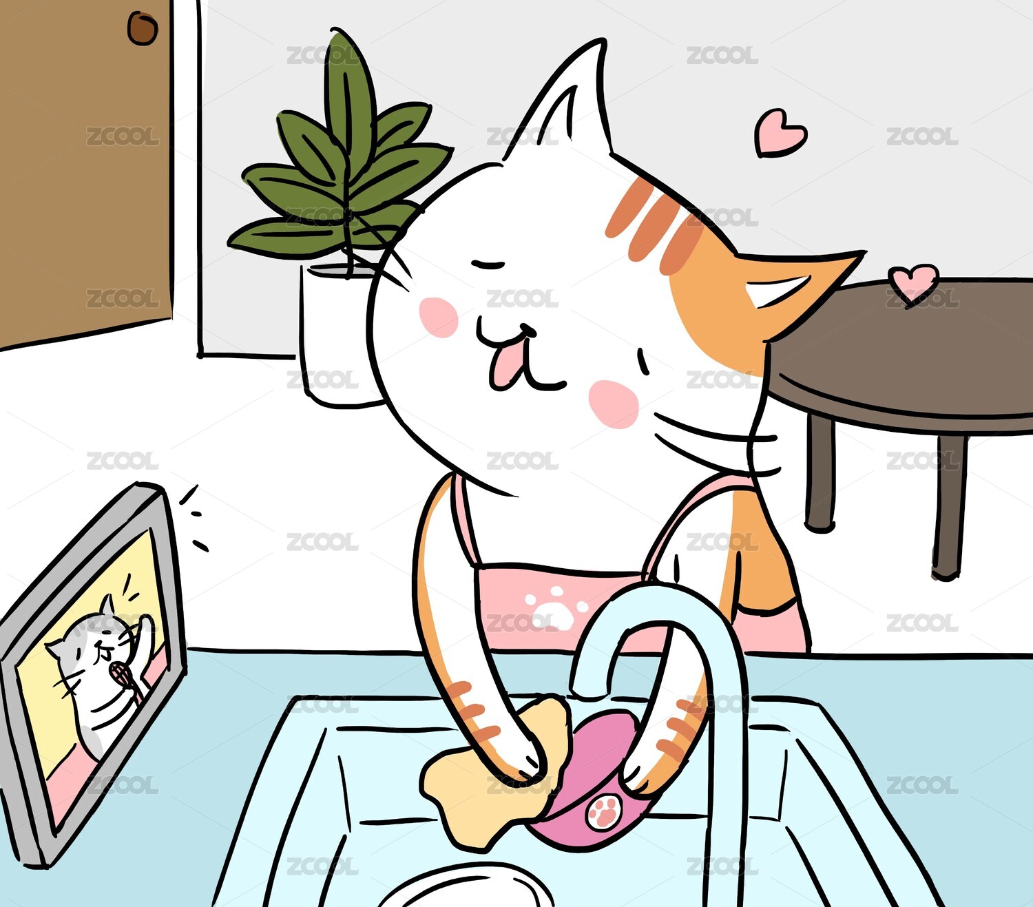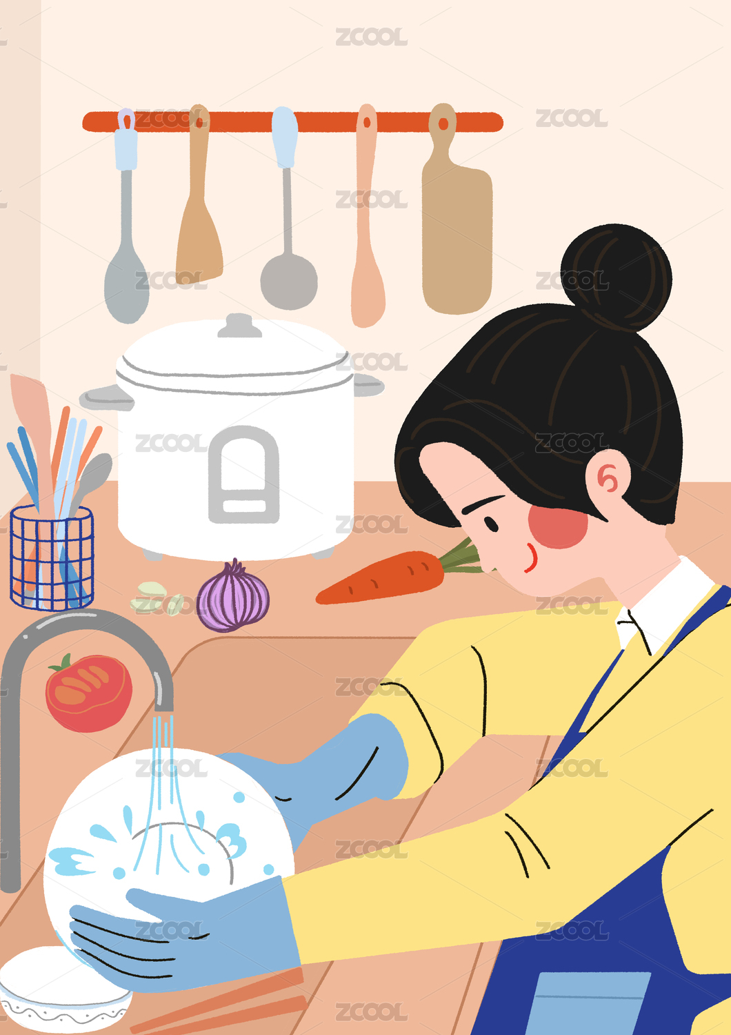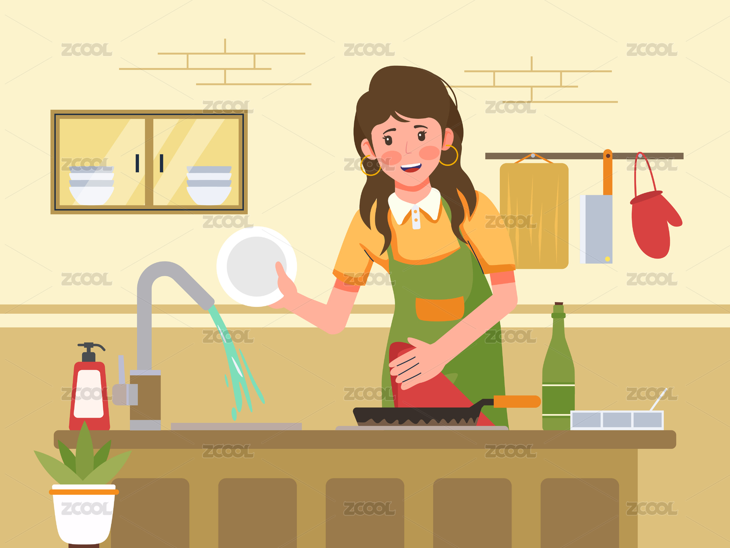 一個(gè)女孩在廚房洗碗扁平風(fēng)插畫