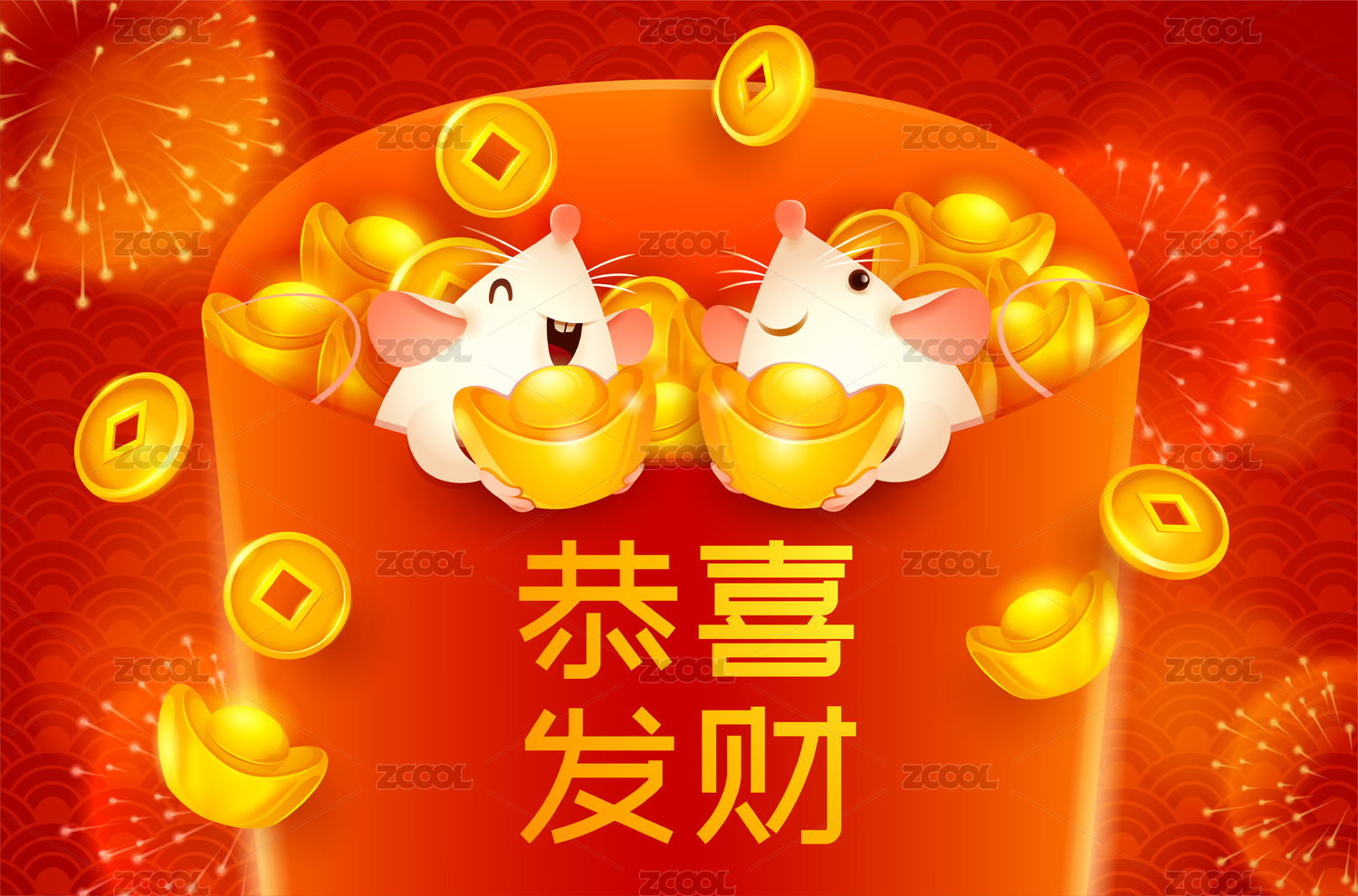 恭喜發(fā)財 卡通老鼠與滿滿金錢金元寶的紅包
