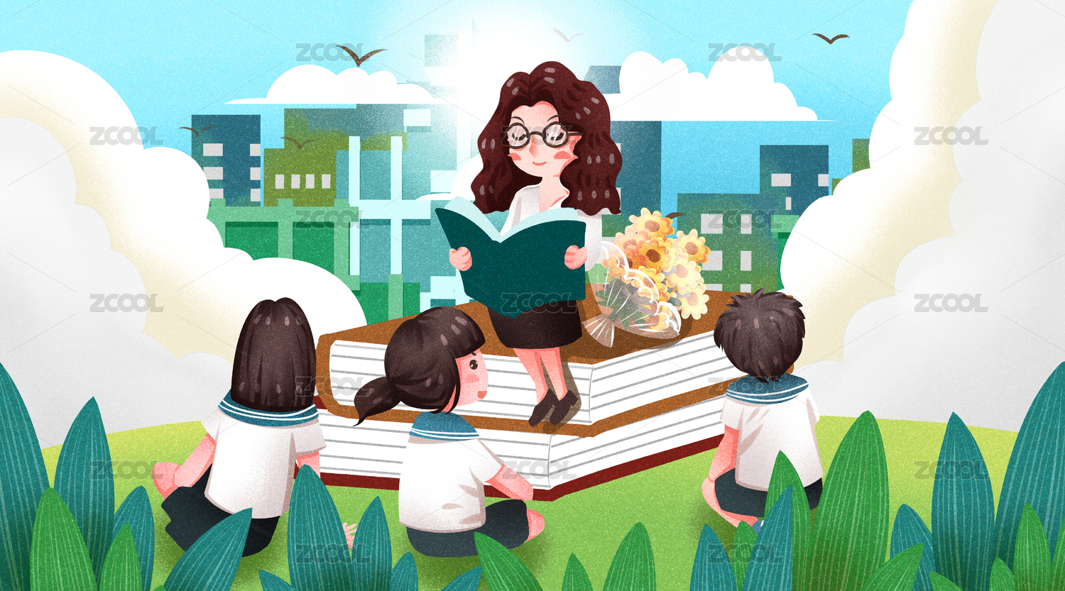 戶外草地上老師教導(dǎo)學(xué)生們學(xué)習(xí)讀書,小清新可愛教師節(jié)插畫
