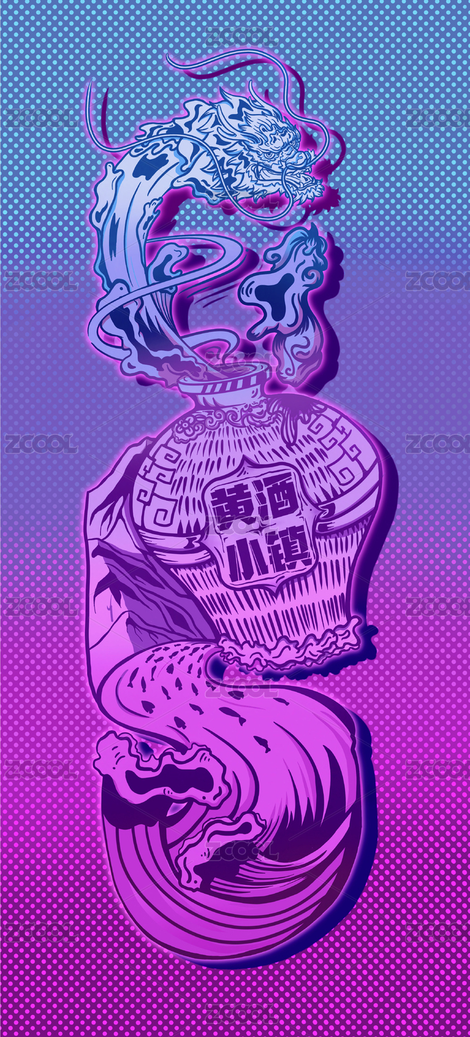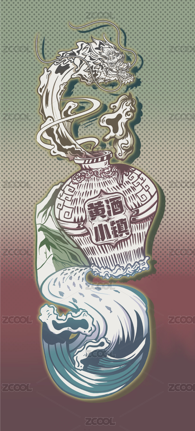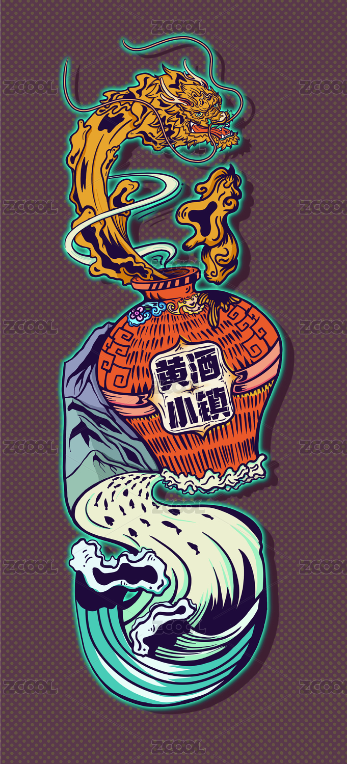 黃酒擬為龍從瓶中濺出,添加紹興水鄉(xiāng)特色