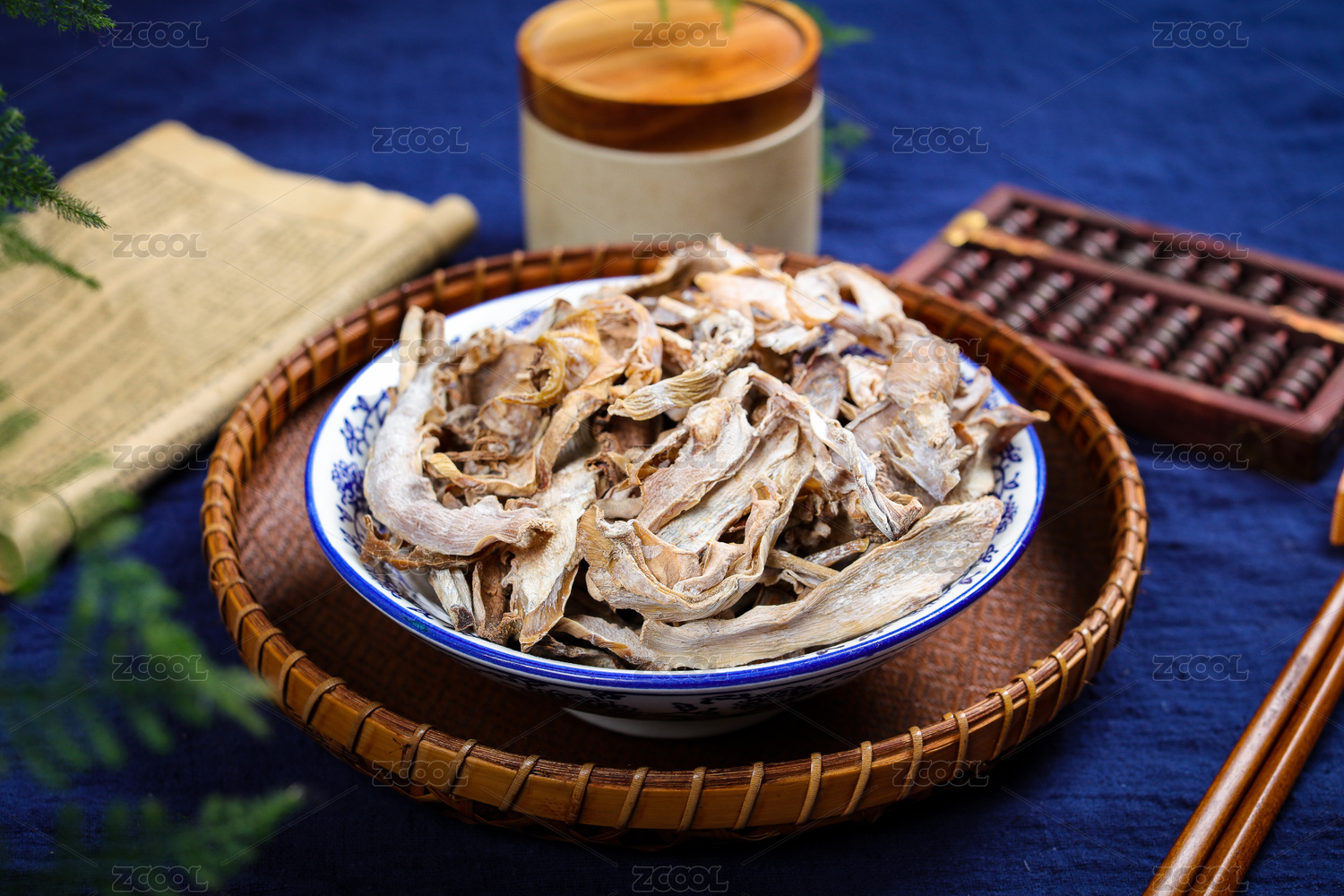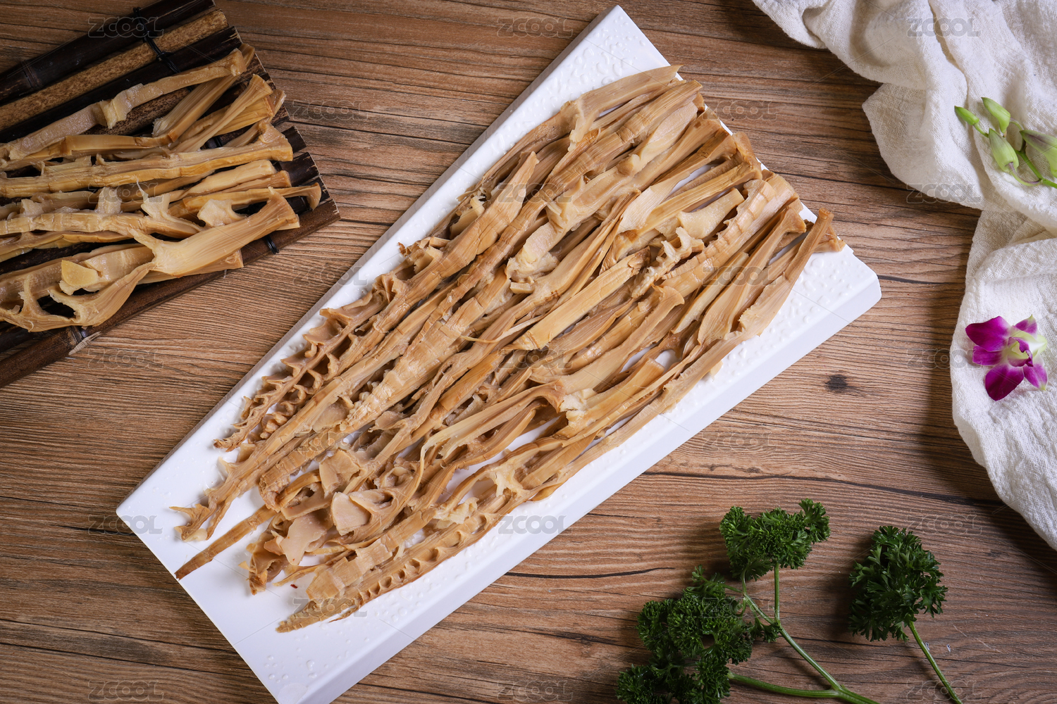 一盤泡發(fā)的干竹筍放在深色桌面上