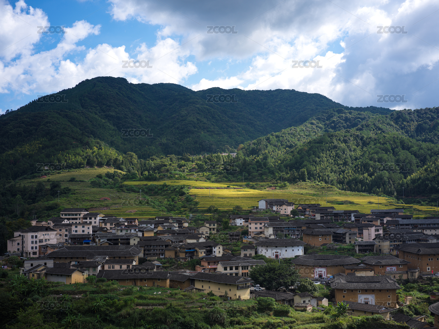 福建省龍巖市初溪土樓青山環(huán)繞的鄉(xiāng)村風(fēng)光