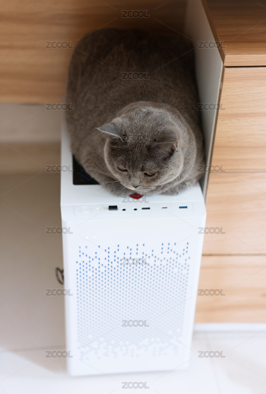 一只寵物貓坐在電腦主機(jī)上,陪伴著主人上班