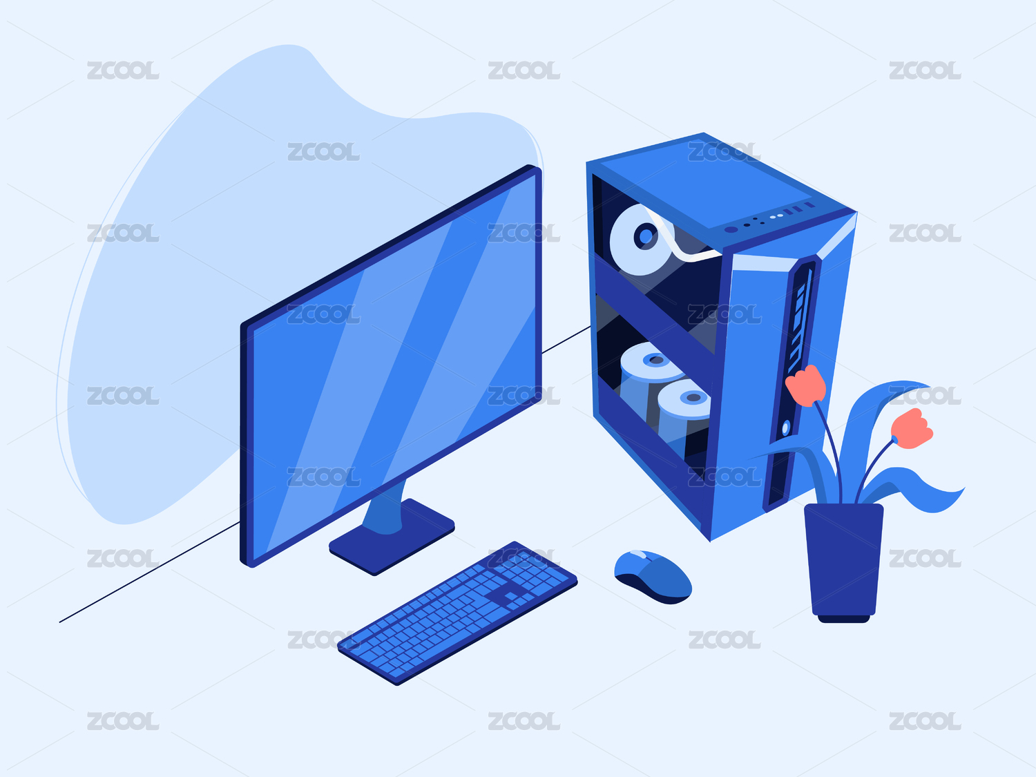 桌上放著顯示器和主機(jī)矢量扁平插畫