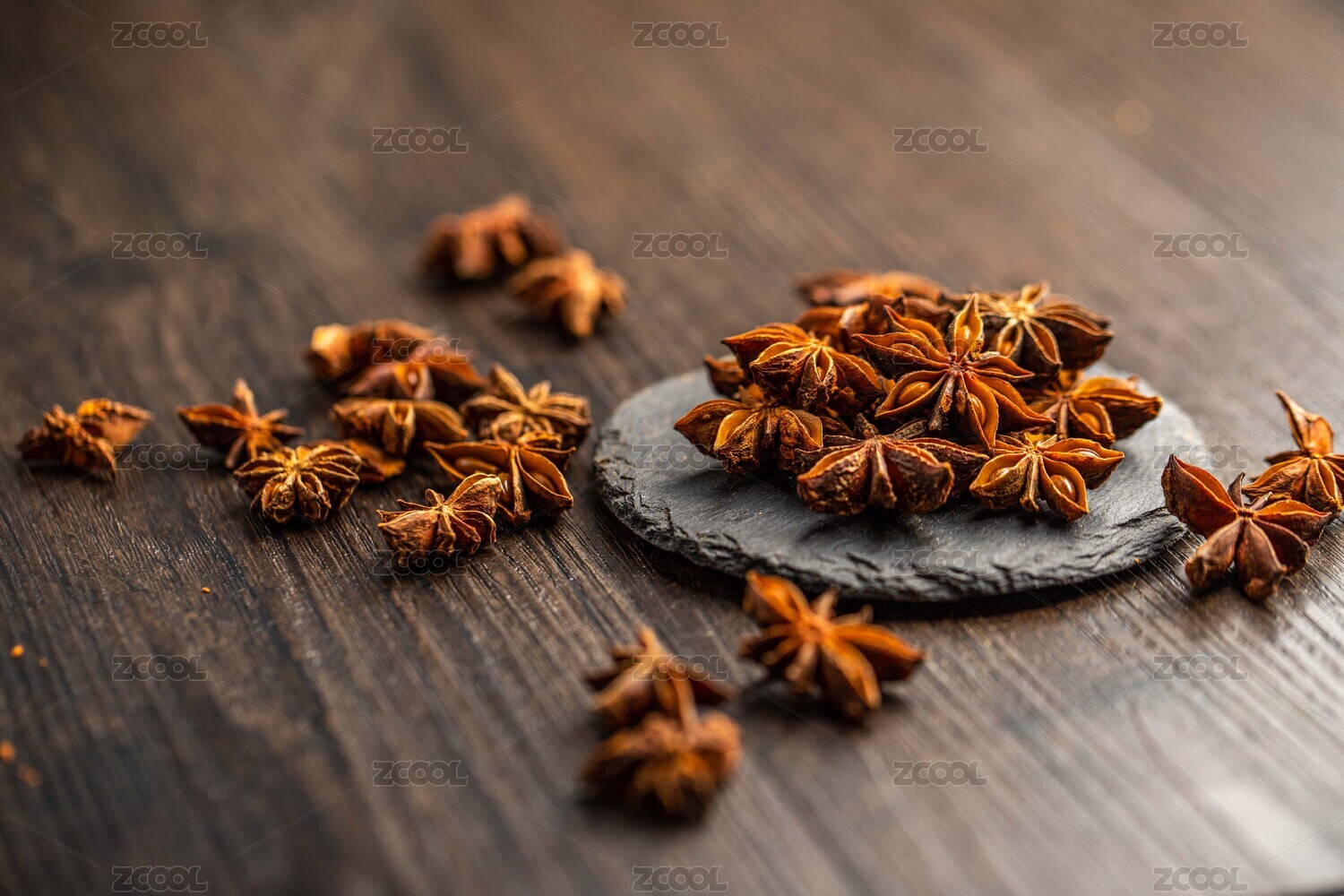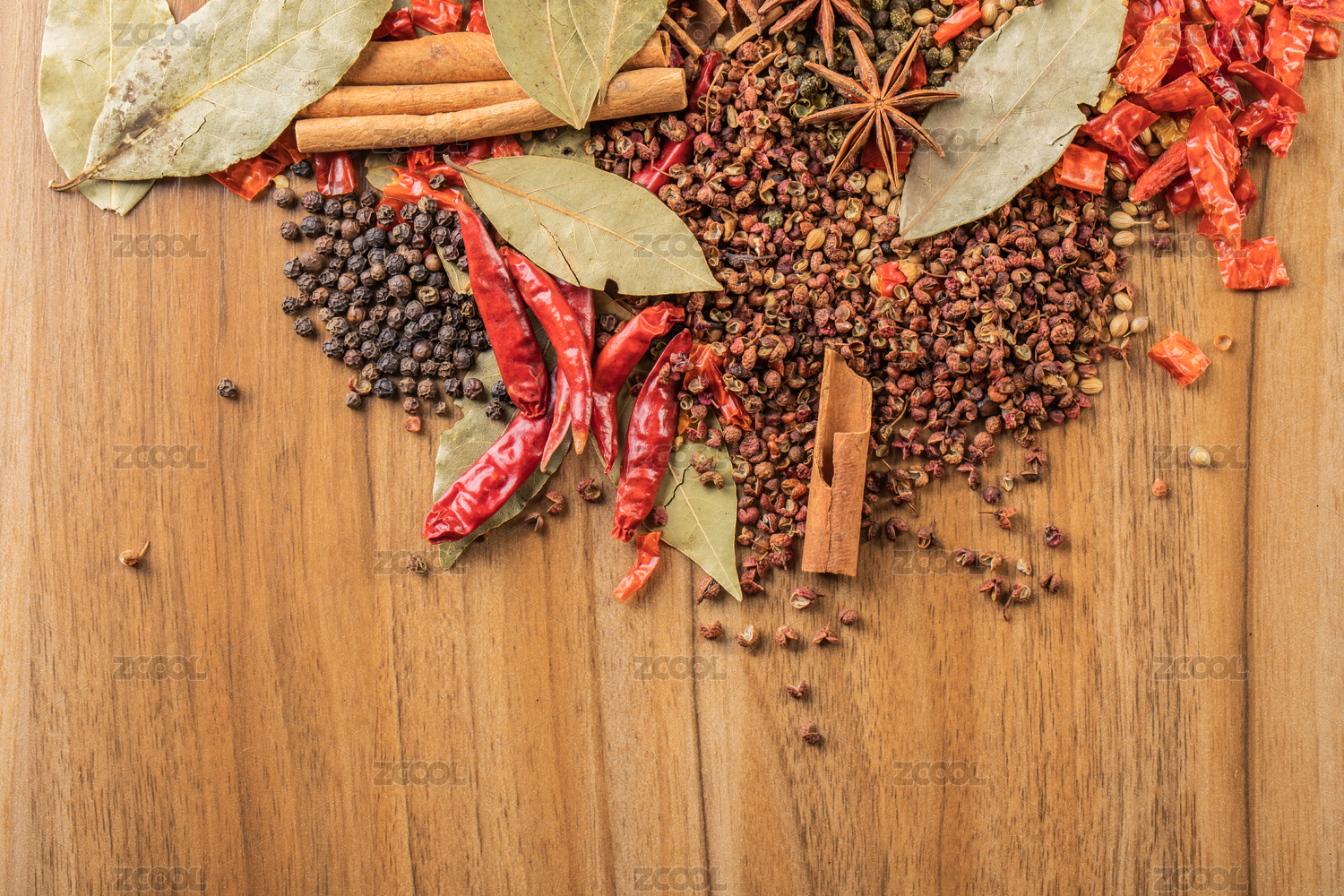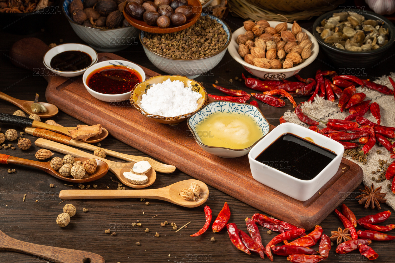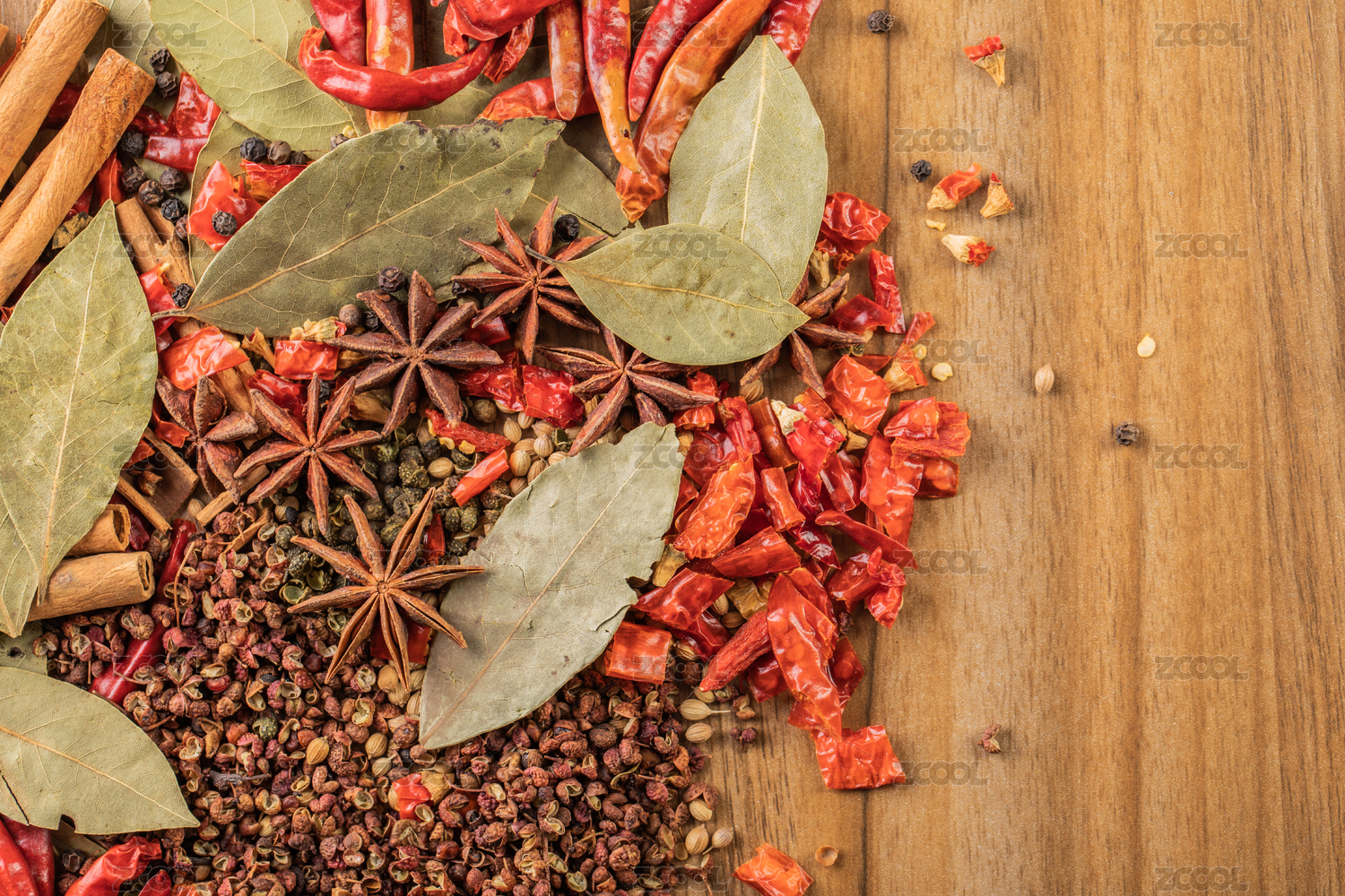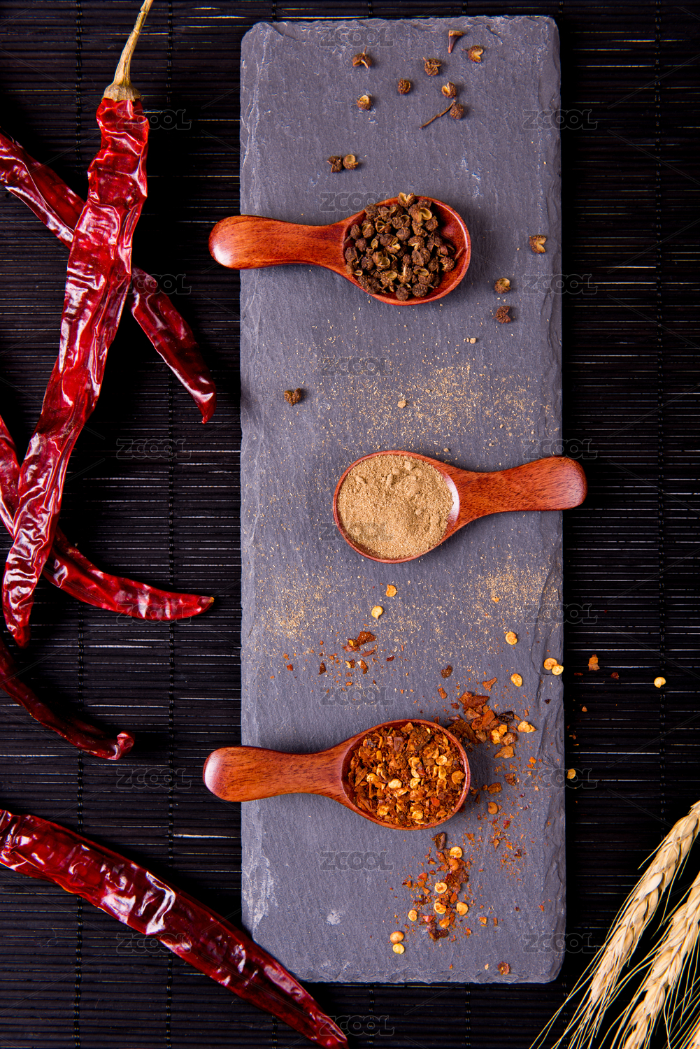 暗色木紋桌上放著一些花椒大料調(diào)味料