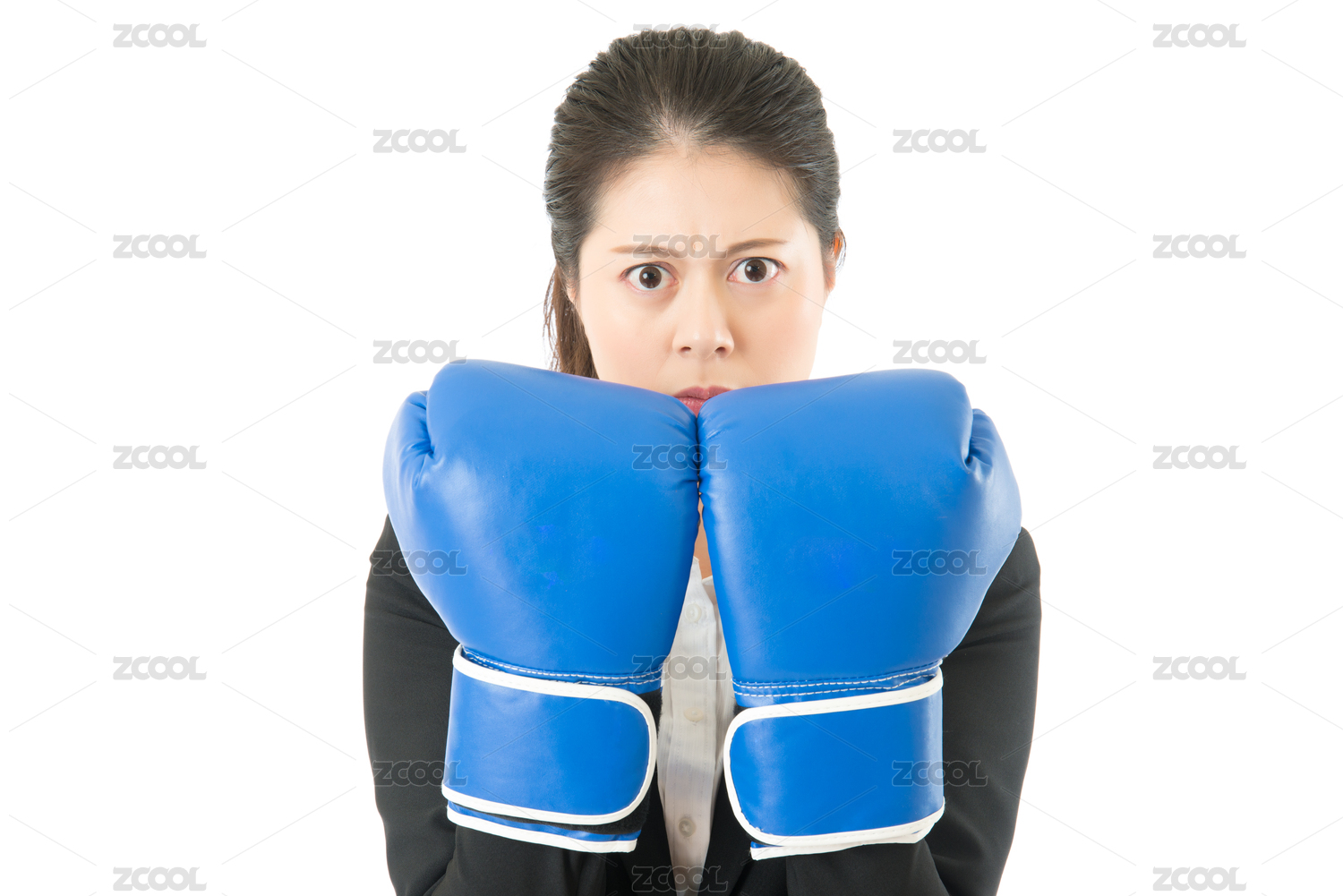 商人穿著準(zhǔn)備打拳擊手套。力量,權(quán)力或年輕漂亮的混血中國(guó)亞洲業(yè)務(wù)隔絕在白色背景的女人競(jìng)爭(zhēng)概念形象。