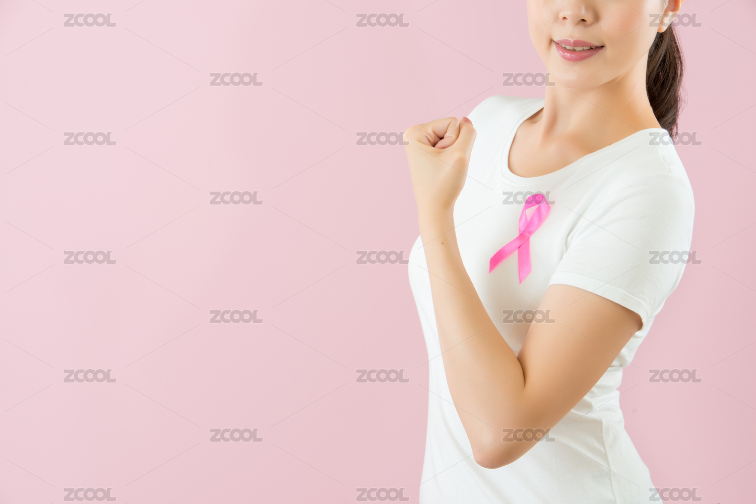 醫(yī)療和健康理念。漂亮健康的亞洲模特在展示胸前針對(duì)女性癌癥的臉被隔絕在粉紅色的背景照相機(jī)她的權(quán)力拳頭的手臂。