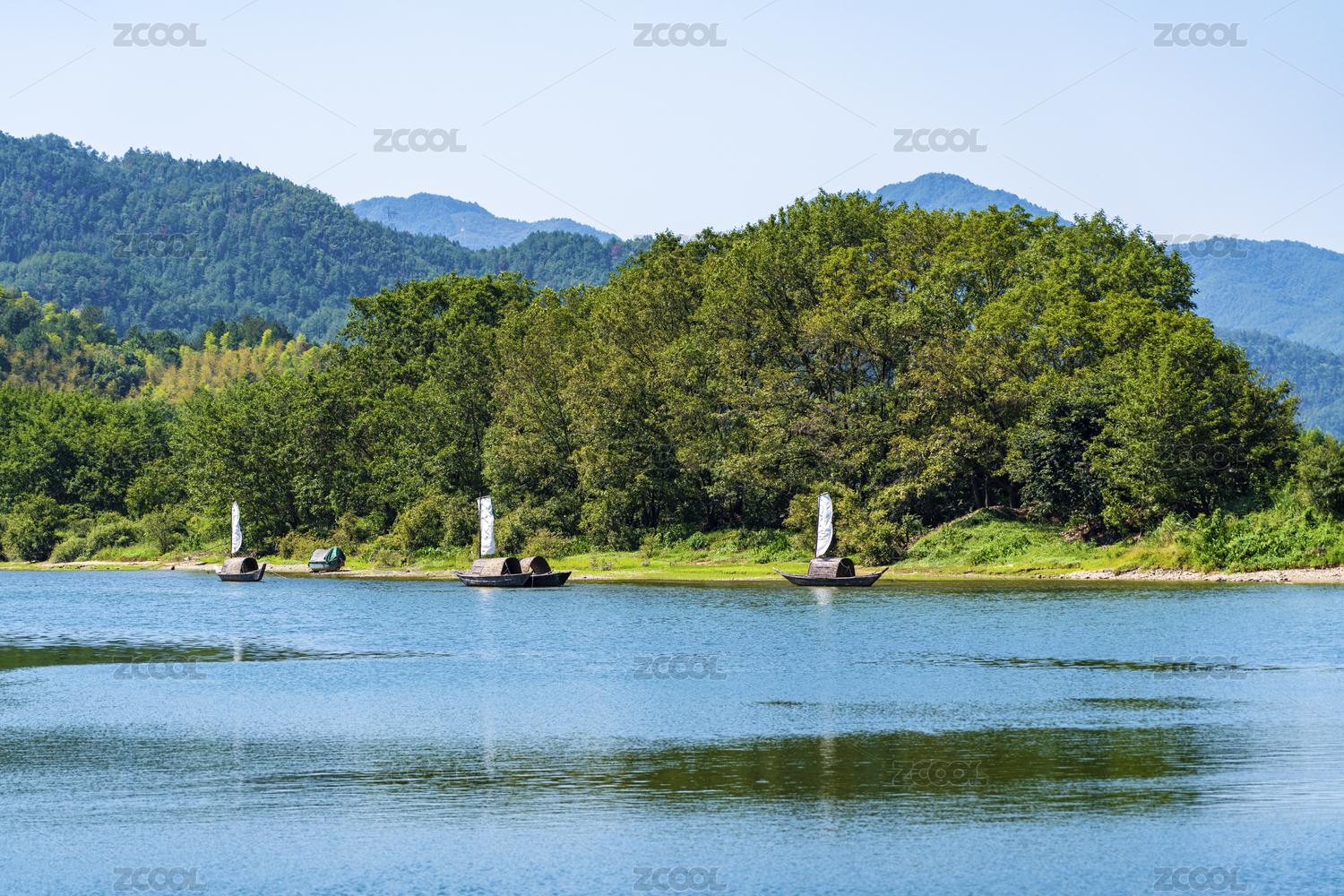 中國(guó)麗水古堰畫鄉(xiāng)的甌江和漁船和山