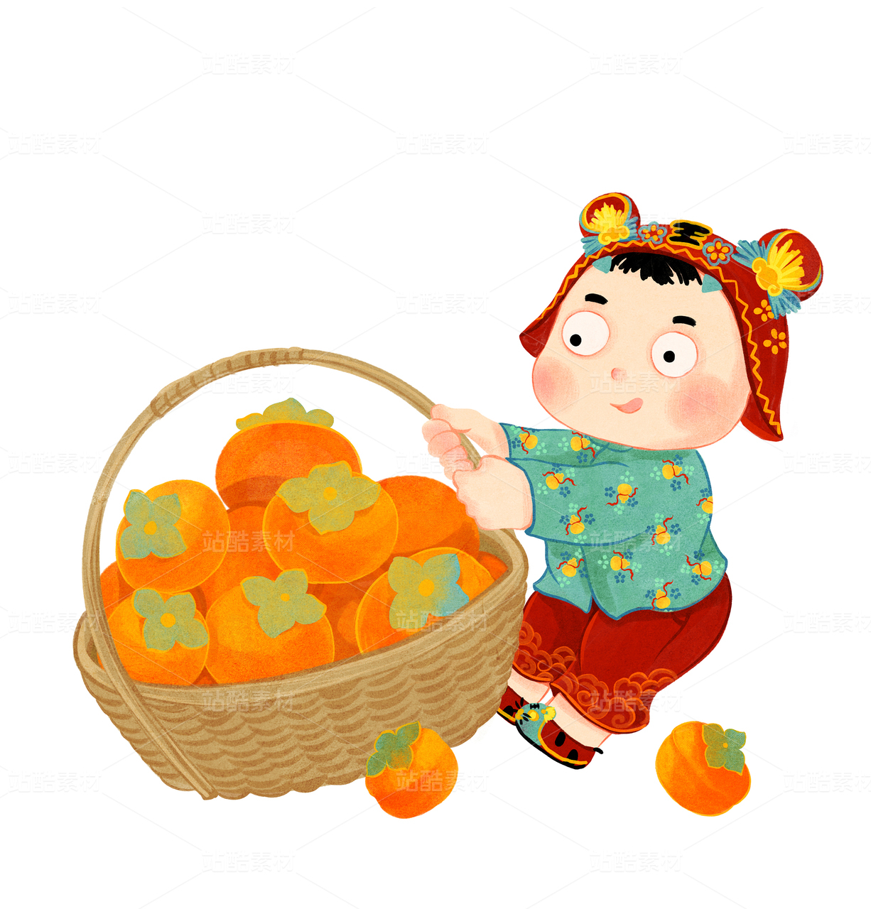 可愛的虎頭帽小男孩拽著一筐柿子紋理繪本插畫