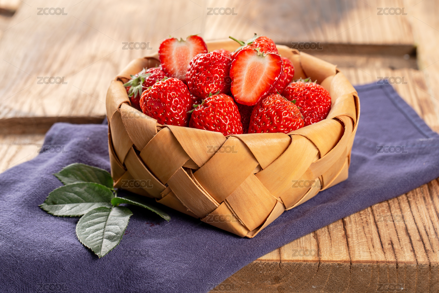 木板背景藍色布上放著一小筐新鮮草莓