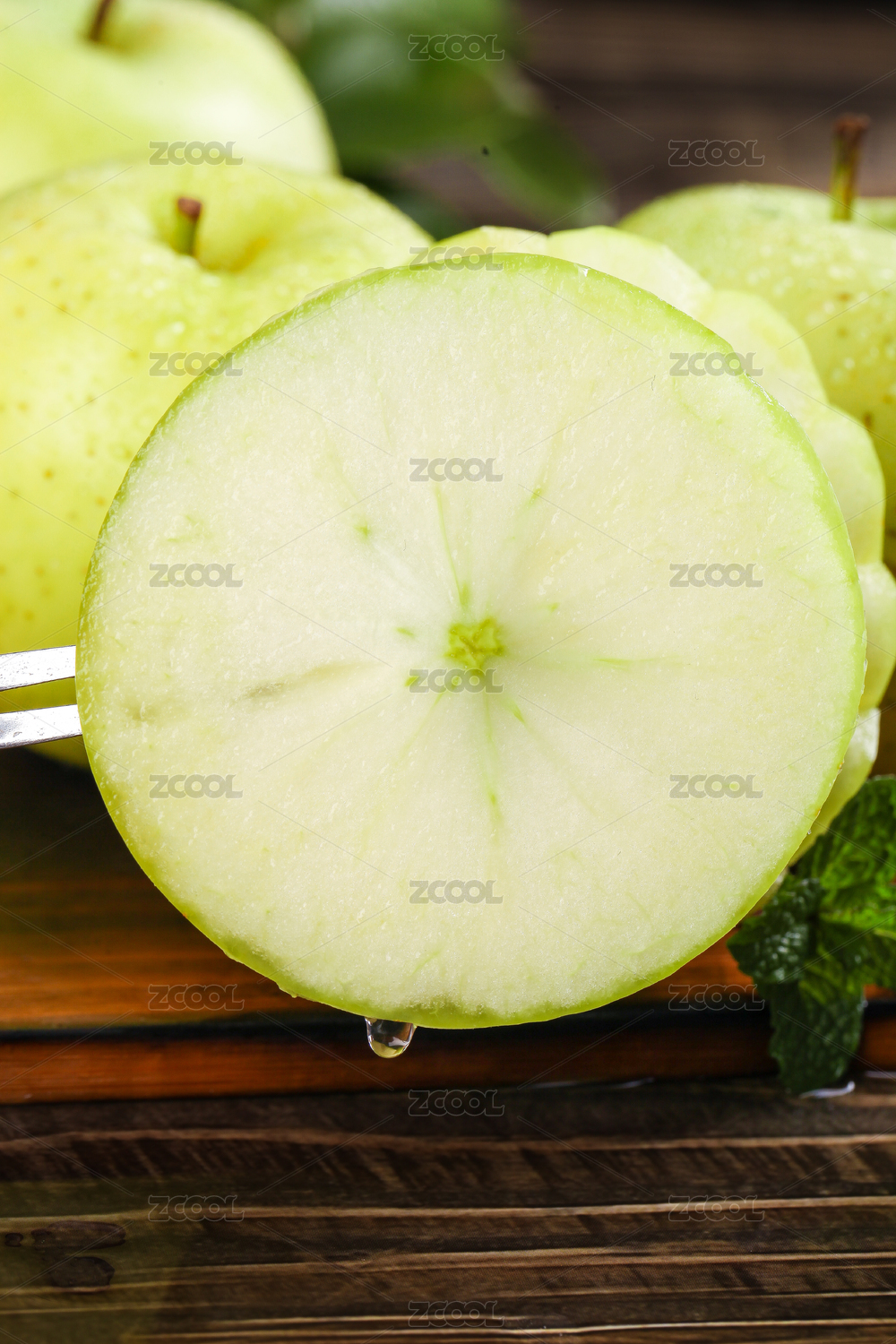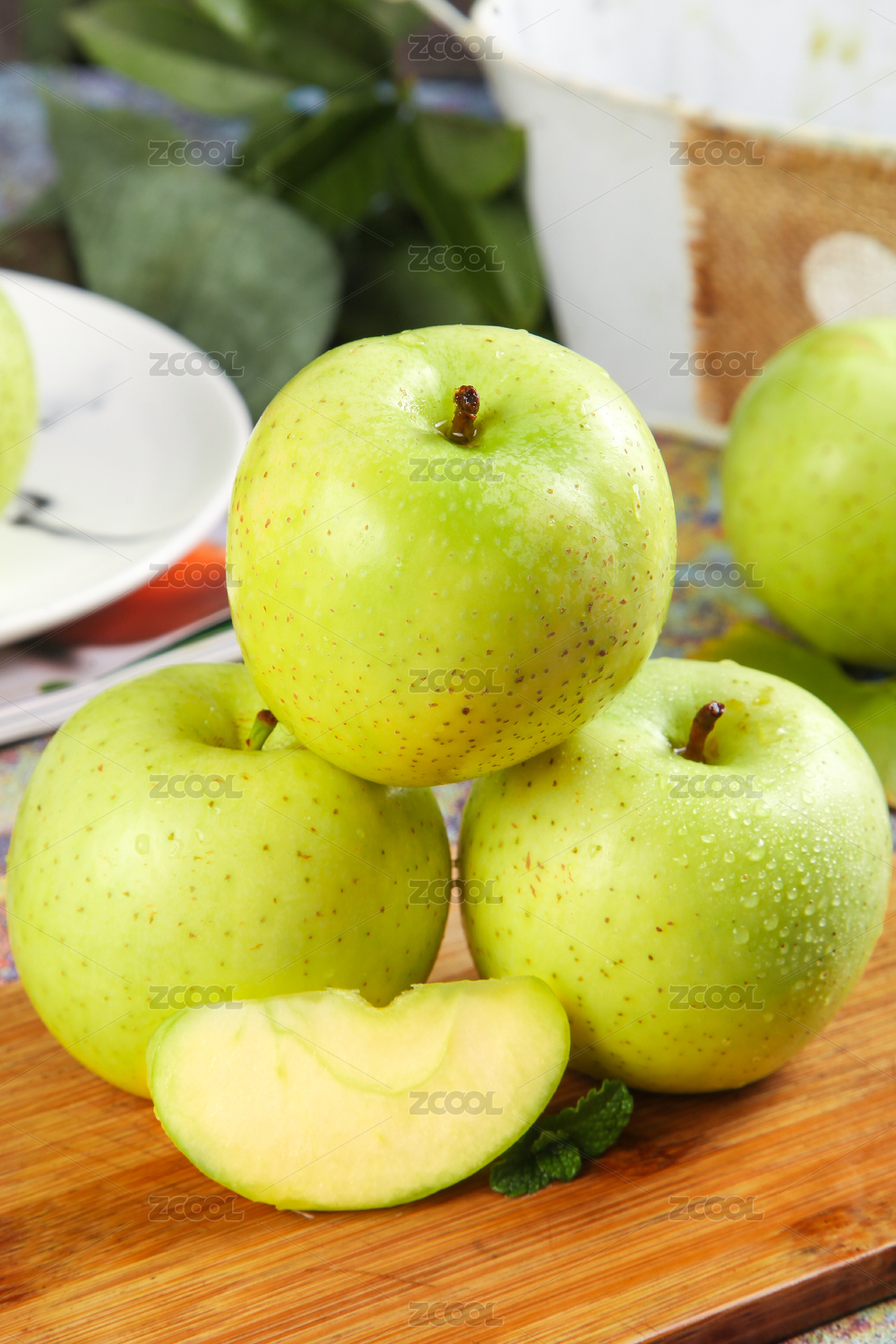 木底上放著三個(gè)青森王林蘋果和一塊蘋果果肉