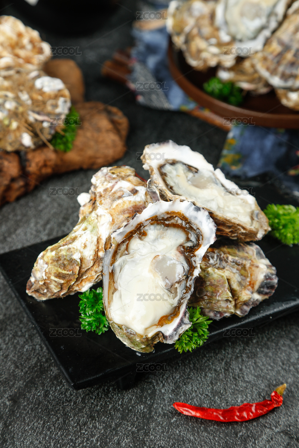 黑石底上放著一堆新鮮生蠔和撬開(kāi)的海蠣子
