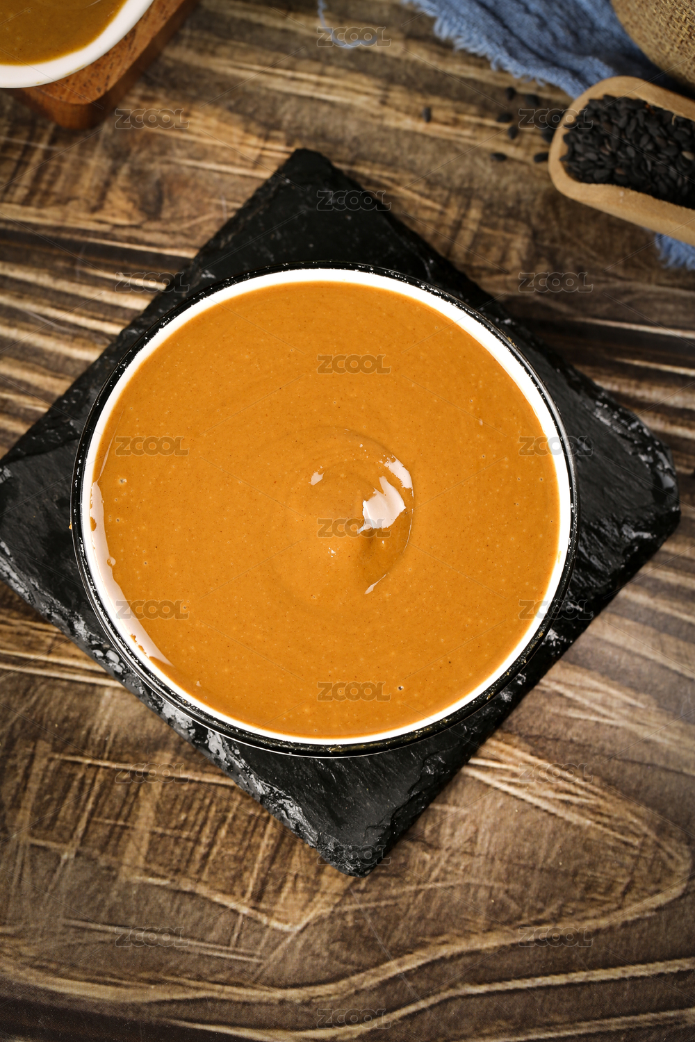 黑石板上放著一盤芝麻花生醬