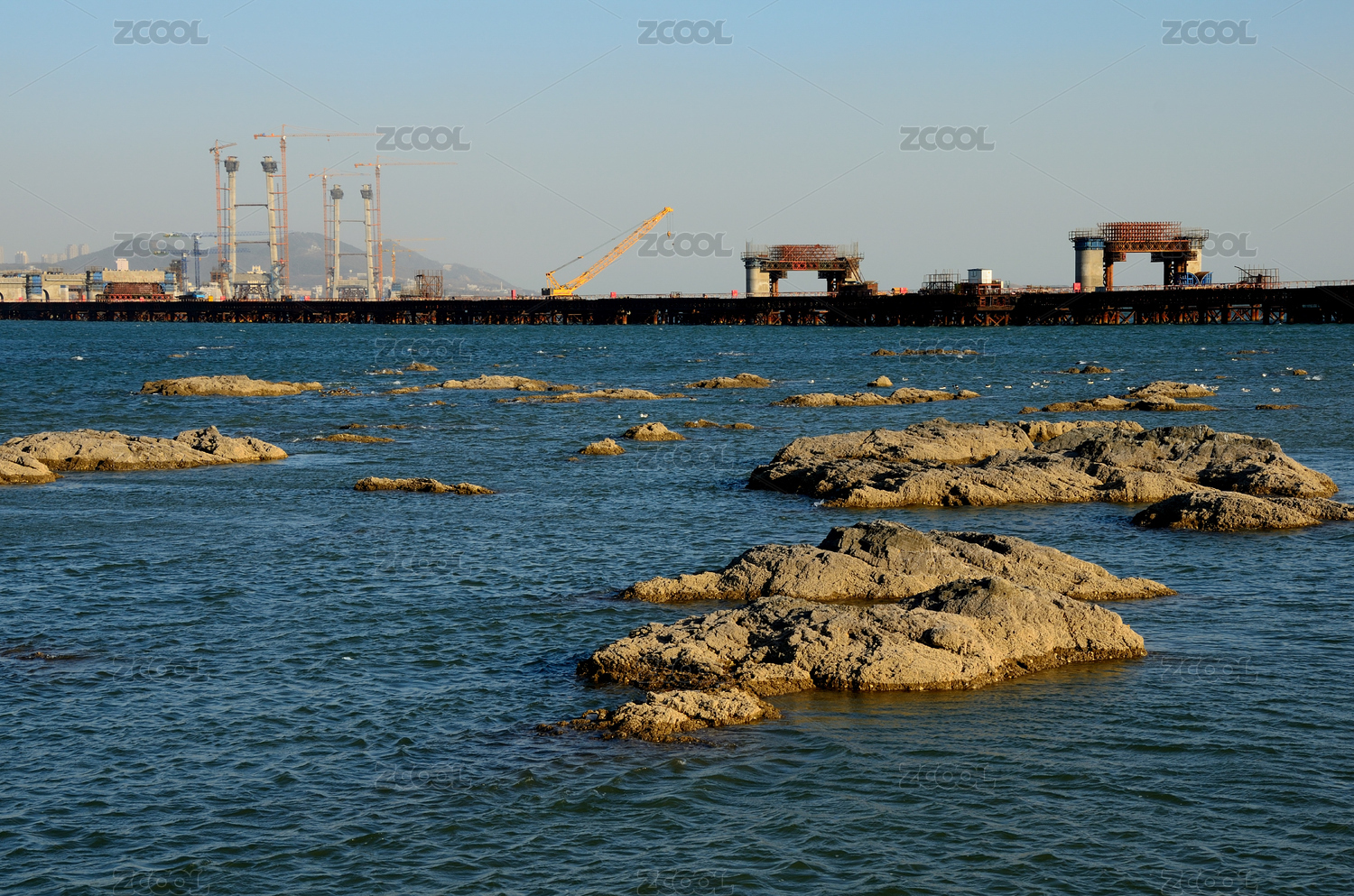 早晨中國(guó)遼寧大連黑石礁和城市跨海大橋