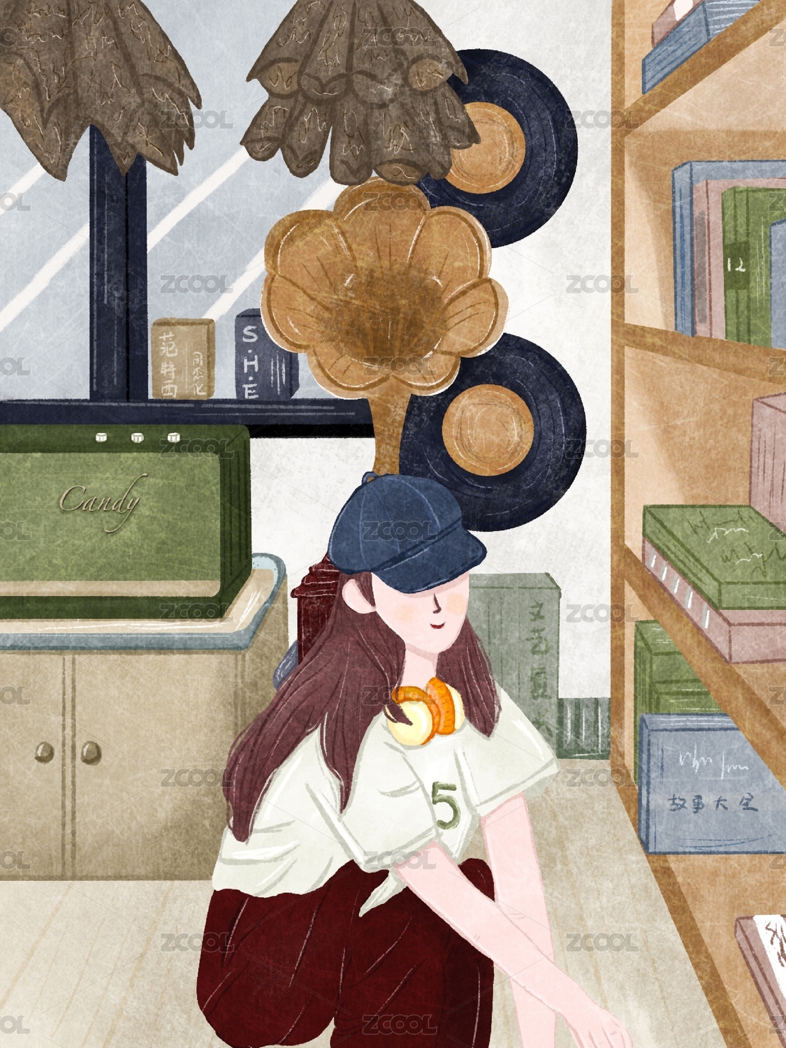 老物件插畫黑膠片小號留聲機(jī)話筒磁帶矢量圖