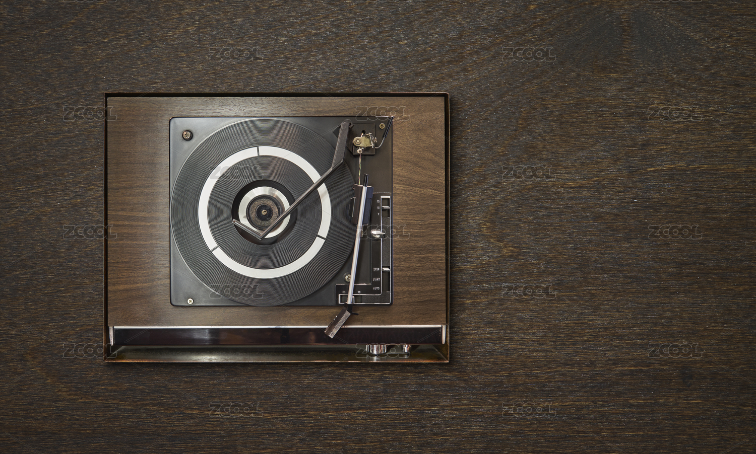 木制桌面上的一臺黑膠唱片機(jī),三維渲染